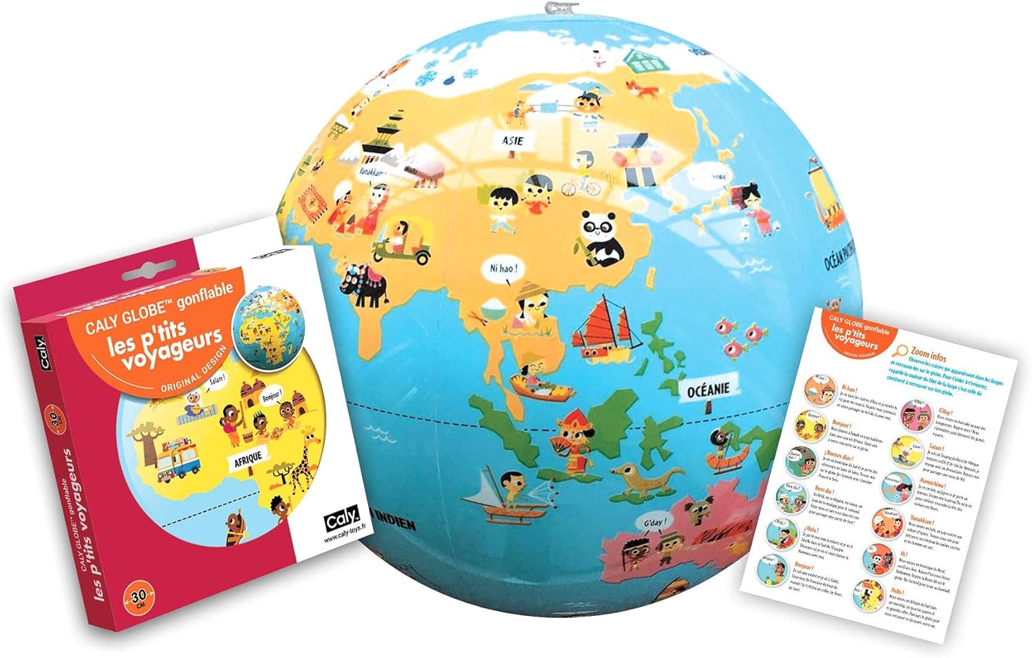 Fait office de ballon, pratique à emmener en voyage et pour expliquer aux petits qui n’ont pas notion de la terre et montrer l’endroit où nous partons en vacances et où vivent les personnes de la famille, pour qu’ils prennent conscience de la terre, des mers et des continents 🙂