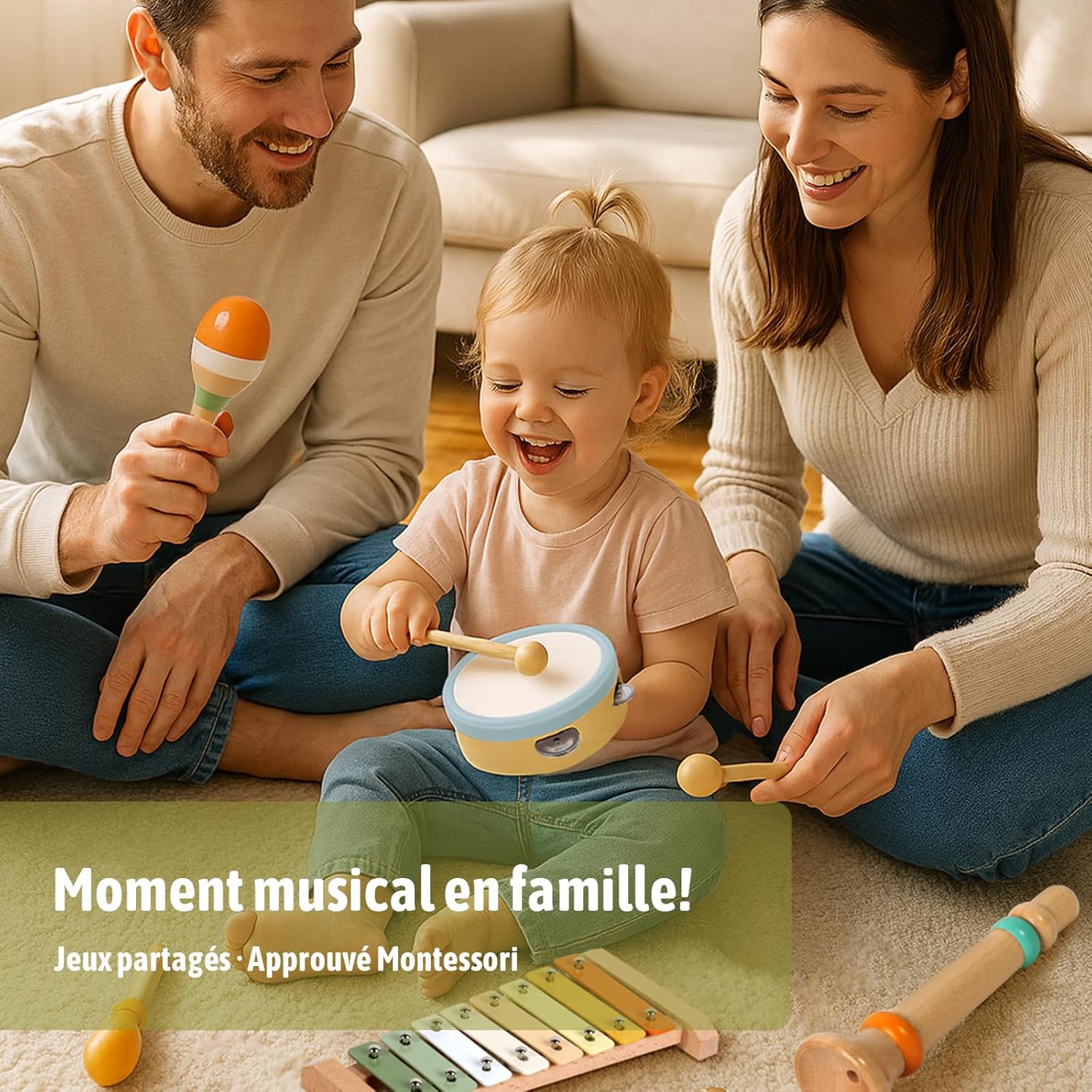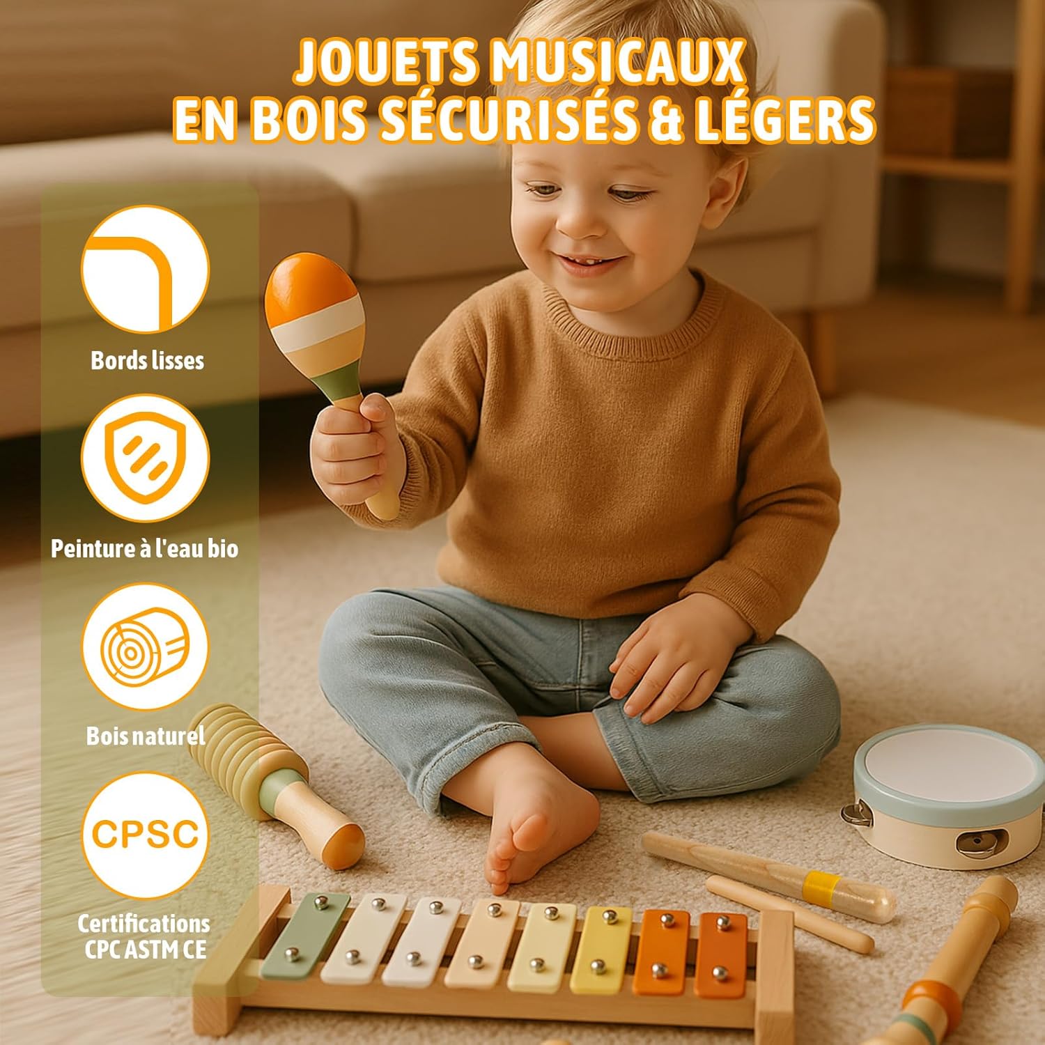 Initiez vos enfants de 1 à 3 ans à la musique et au développement sensoriel avec cet ensemble d’instruments de musique en bois Montessori, alliant sécurité, design naturel et stimulation éducative.