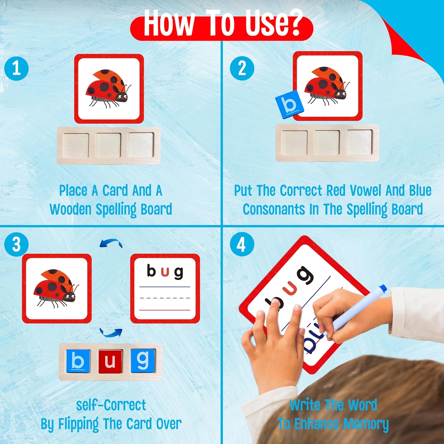 L’approche pédagogique de ce jeu repose sur la manipulation active et le plaisir d’apprendre. Grâce aux cartes recto verso, votre enfant peut associer des images à des mots, puis pratiquer leur orthographe sur les planches d’écriture. Les blocs de lettres en bois permettent de former physiquement les mots, renforçant ainsi la mémoire visuelle et kinesthésique. Un simple retournement de la carte suffit pour vérifier les réponses, offrant une satisfaction immédiate et encourageant l’autonomie dans l’apprentissage.