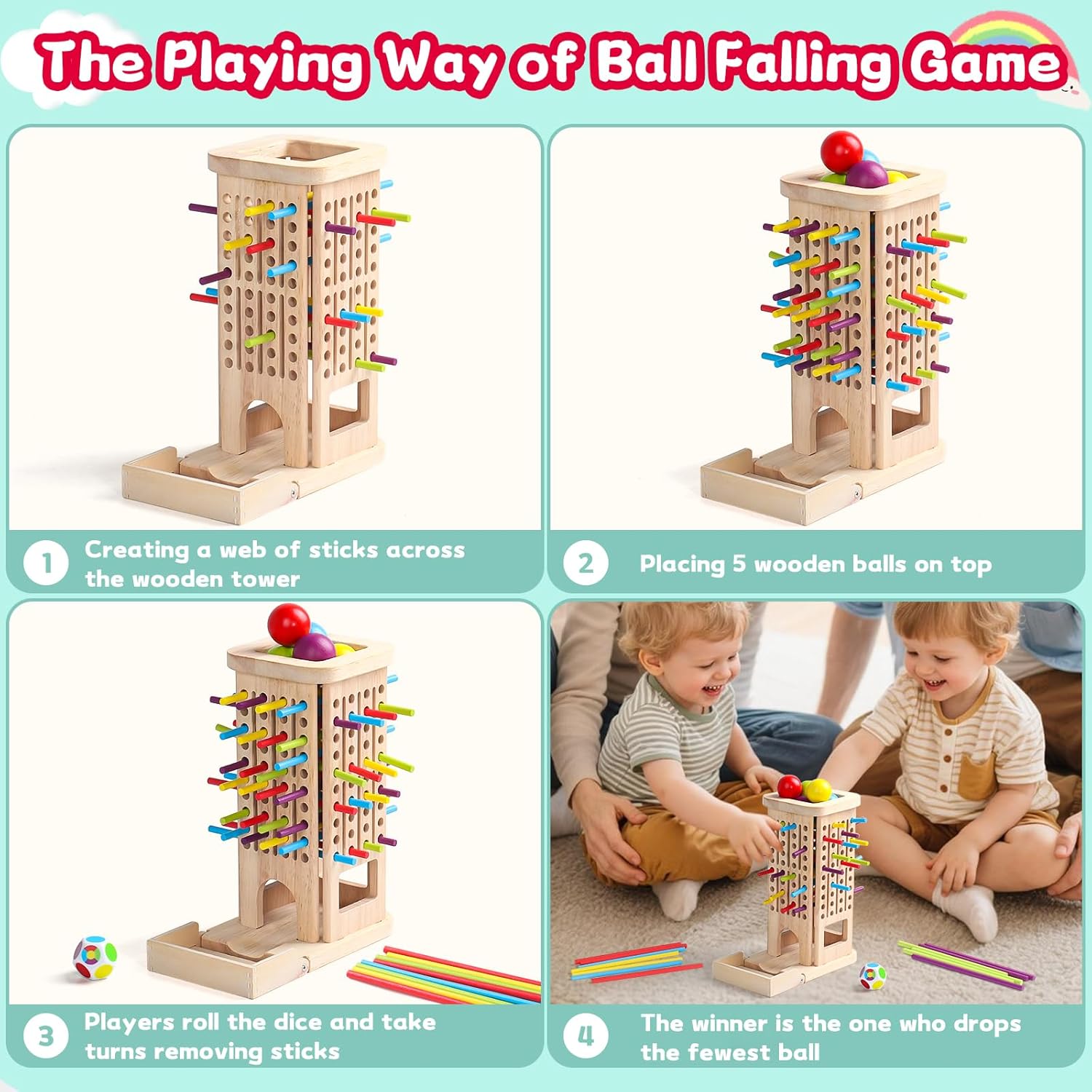 - Le jeu de la balle qui tombe : Il encourage la réflexion logique et stratégique. L’enfant doit décider quel bâton retirer pour éviter que la balle ne tombe.