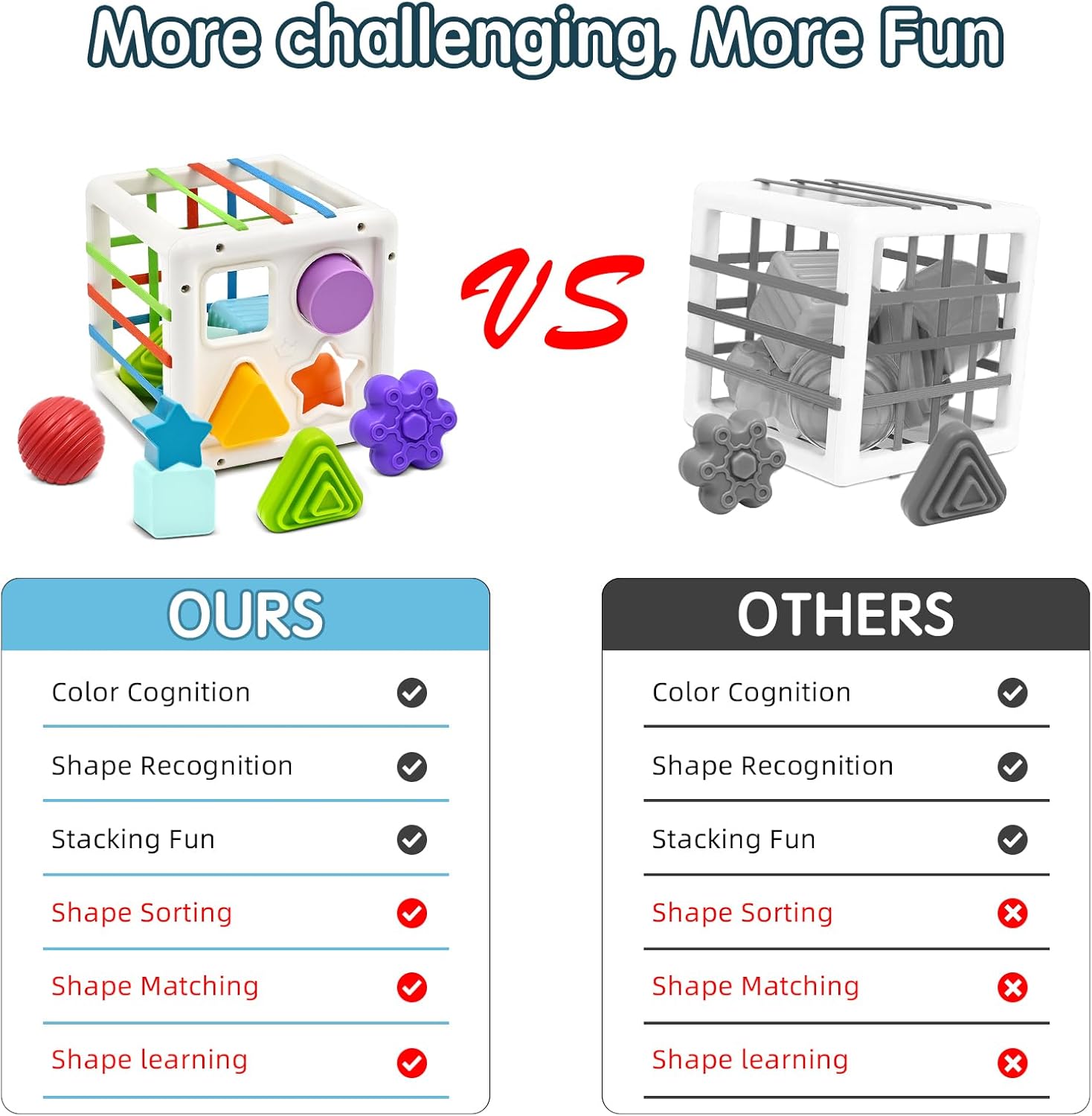 Ce jouet bébé trieur de formes se distingue par son design astucieux et polyvalent. Composé d’une boîte sensorielle dotée d’élastiques colorés, de 4 trieurs de formes et de 5 blocs de construction texturés faciles à manipuler, il offre une multitude de possibilités de jeu. Les enfants apprennent à associer chaque forme à son emplacement, à insérer et retirer les blocs, ce qui renforce leur capacité à résoudre des problèmes tout en stimulant leur imagination.