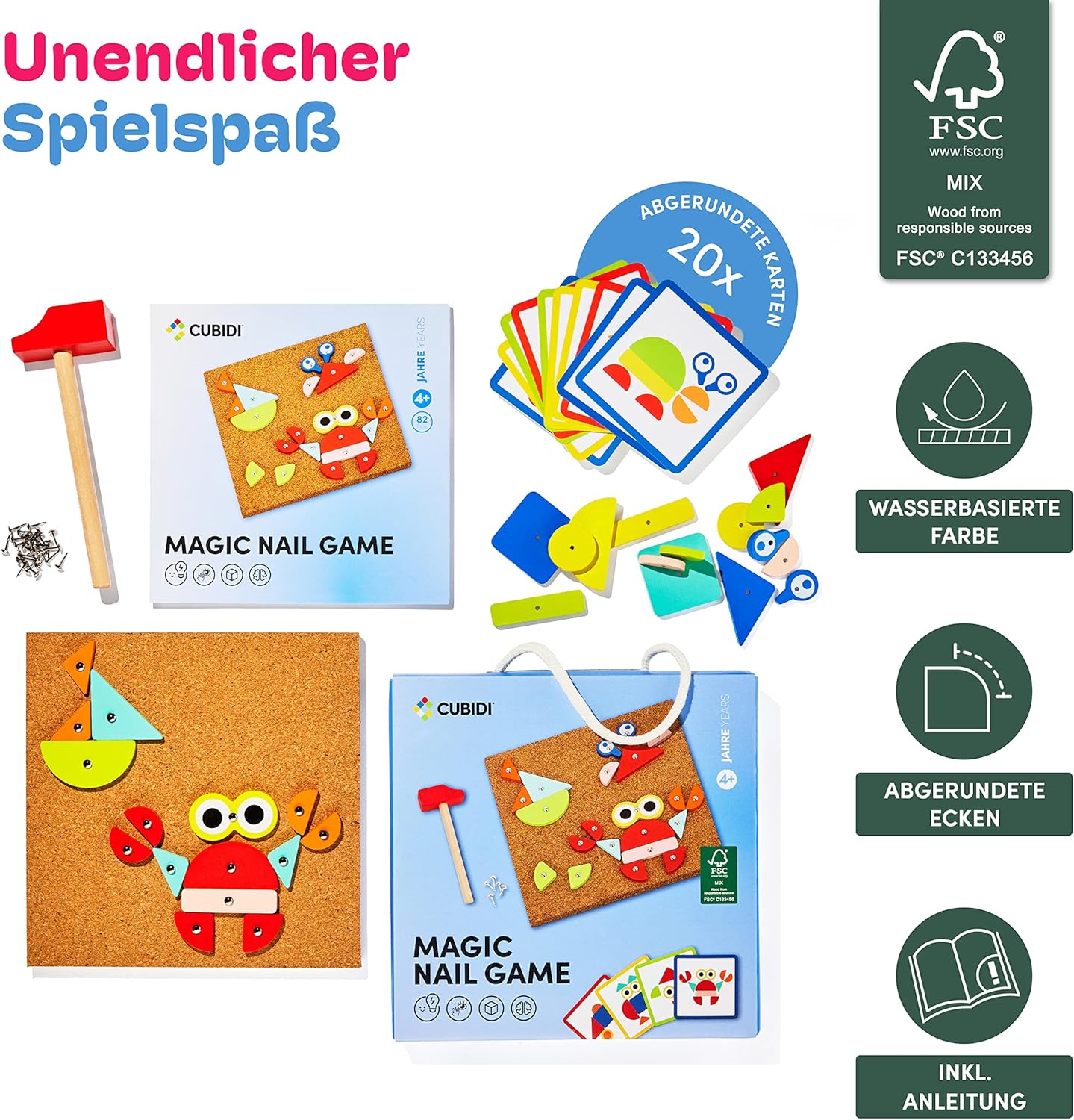 Grand coup de cœur de notre fille de deux ans et demi sur ce jeu. Elle qui assiste beaucoup son papa lors du bricolage a été ravie de pouvoir planter elle même les clous. Il faut juste rester très vigilant à côté car lorsque que les clous tombent au sol il peuvent rester pointé vers le haut. Sinon je le trouve magnifique dans les formes, les couleurs et les propositions faites par les cartes. La plaque de liège est bien épaisse. Pour le prix on est vraiment ravis!