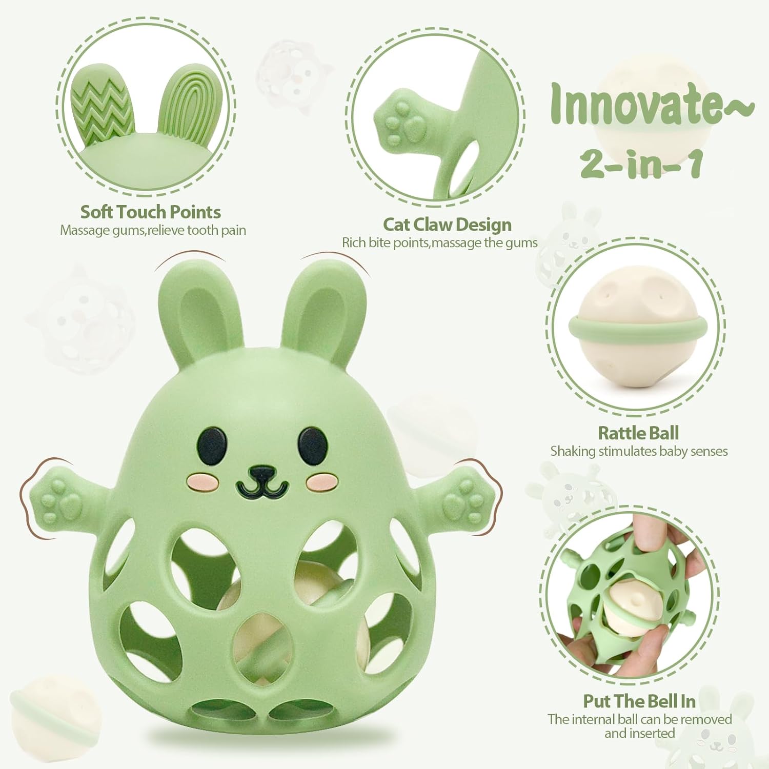 Doté de formes variées, telles qu’un lapin espiègle ou un hibou curieux, ce jouet capte immédiatement l’attention des plus jeunes. La balle sensorielle émet un doux bruissement lorsqu’elle est manipulée, encourageant ainsi l’exploration sonore. Les points de mastication en silicone alimentaire, souples et sans danger, sont spécialement conçus pour apaiser les douleurs liées à la poussée dentaire. Ce jouet est non seulement amusant, mais il renforce également la préparation motrice en développant la force de préhension et la coordination œil-main.