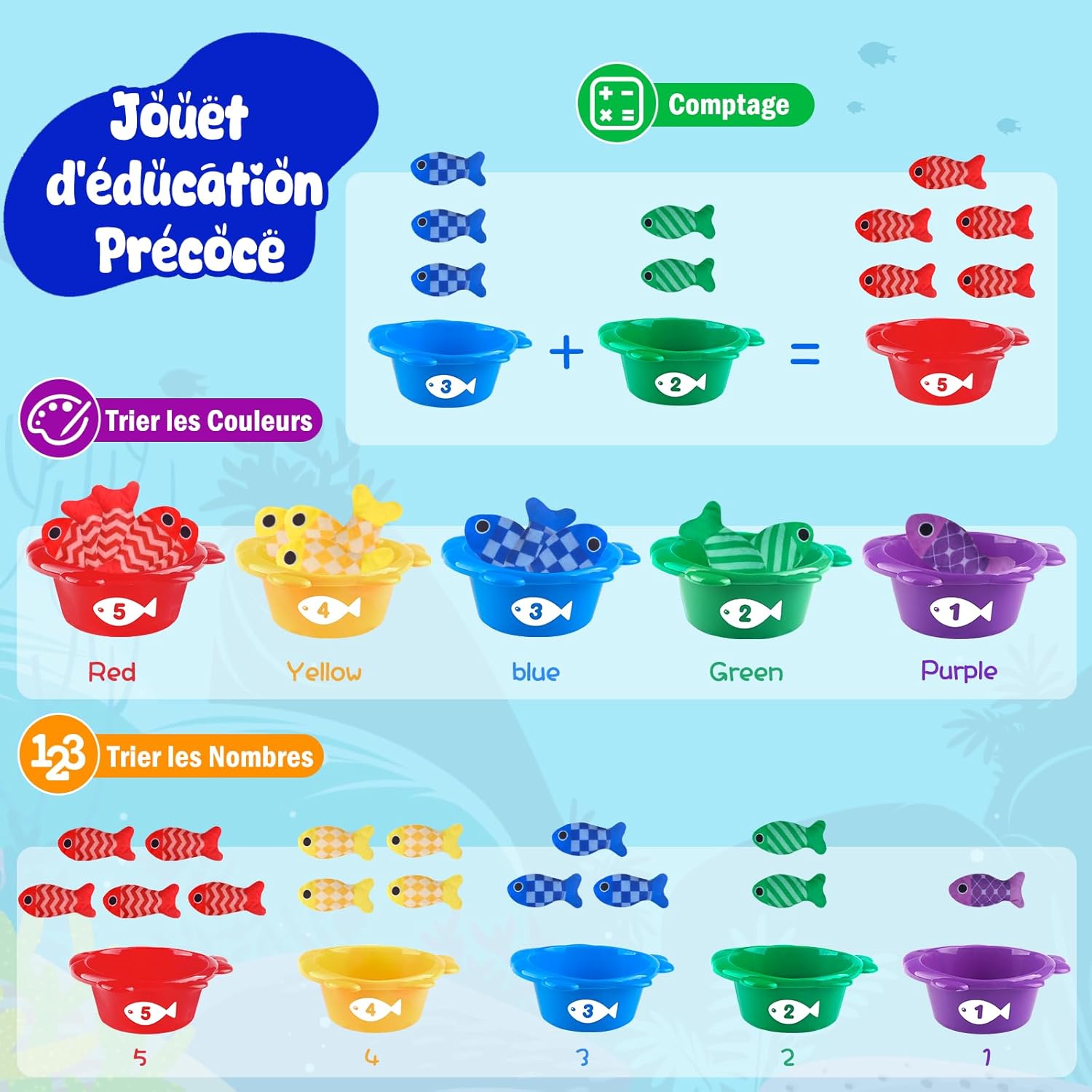 Ce jouet de pêche va bien au-delà d’une simple activité ludique. Il est conçu pour initier les plus jeunes aux bases de la cognition. En manipulant les petits poissons colorés et les gobelets empilables, les enfants peuvent apprendre à reconnaître les couleurs, à compter ou même à s’initier aux premiers calculs simples. Les parents peuvent accompagner leur enfant dans ces découvertes en organisant des activités comme le tri par couleur ou le dénombrement des poissons, renforçant ainsi leur pensée logique et leurs capacités d’analyse.