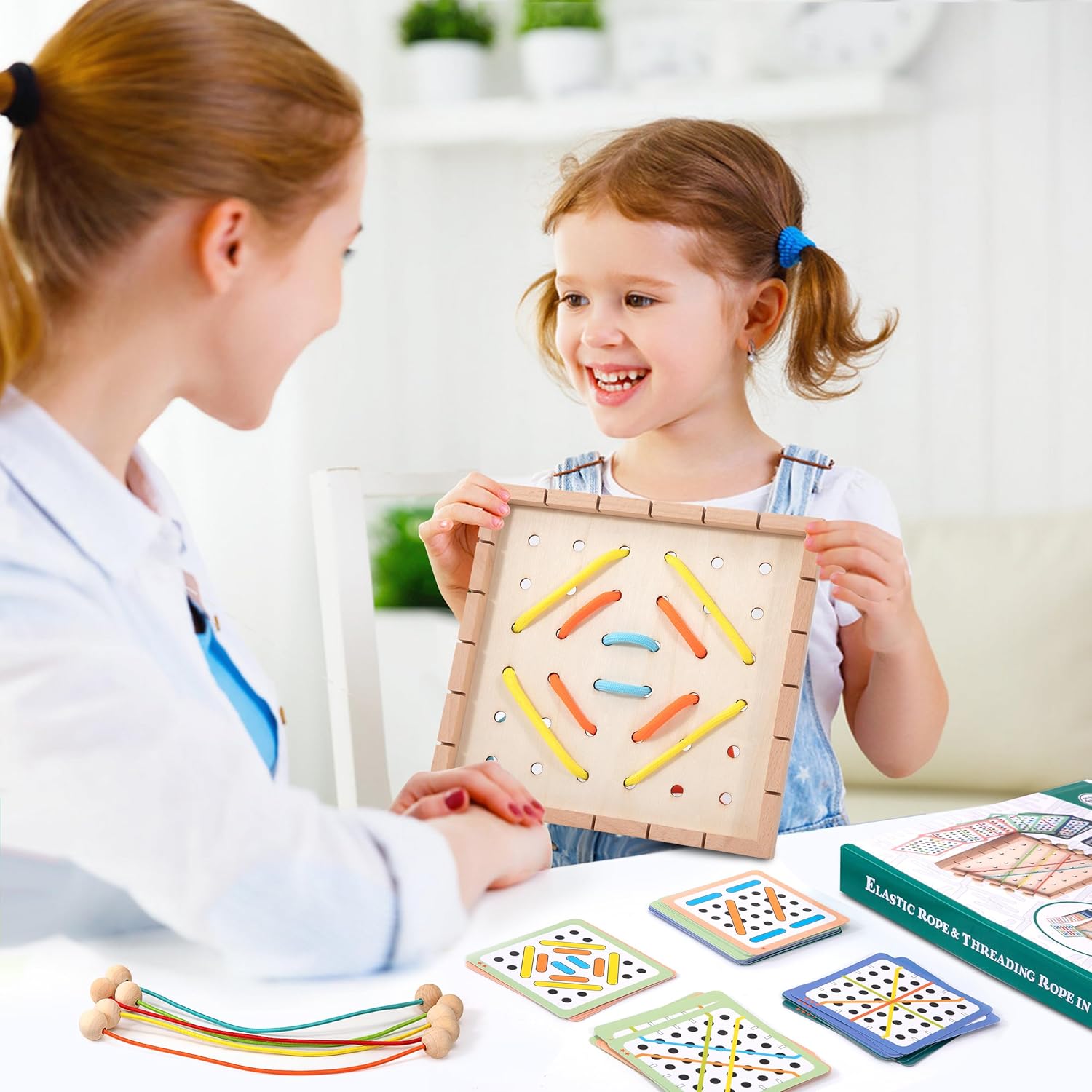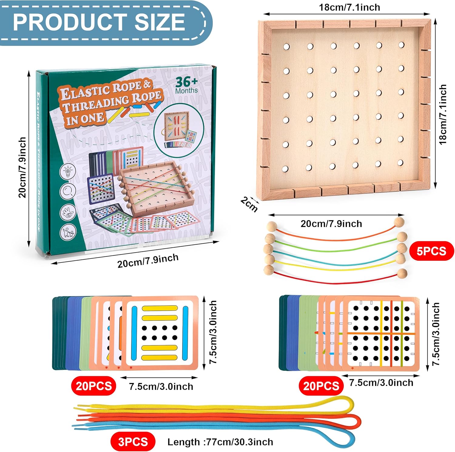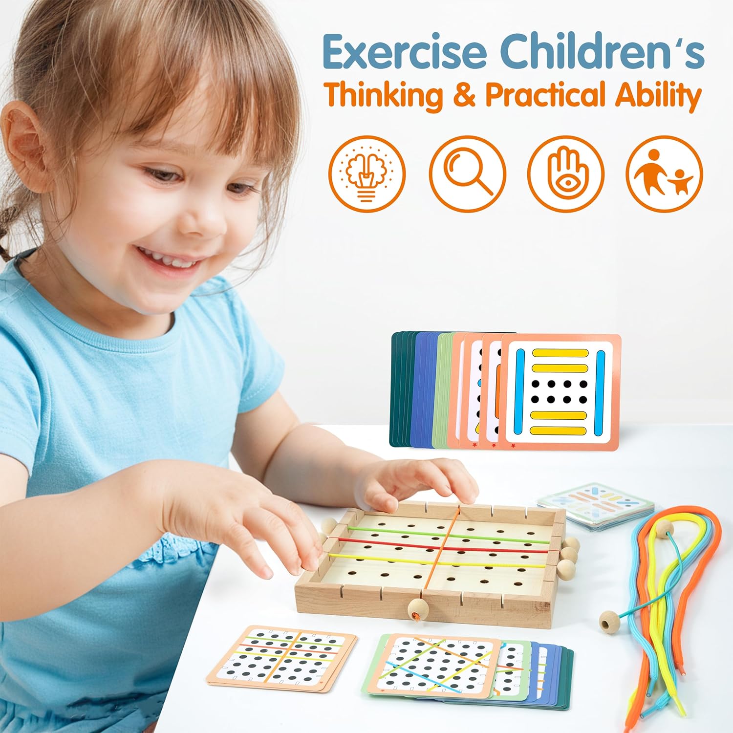 Offrez à votre enfant un géoplan Montessori en bois, robuste et sûr, pour développer sa motricité fine, sa créativité et ses compétences en mathématiques grâce à 40 motifs éducatifs stimulants.