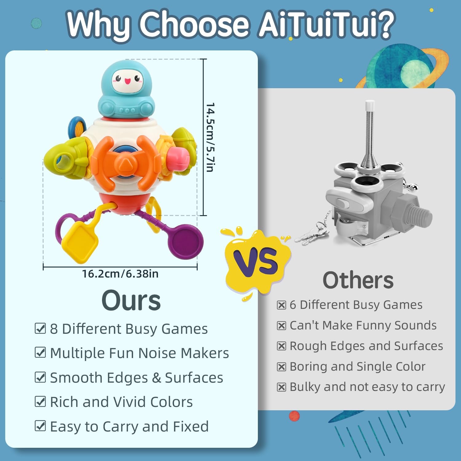 Que ce soit en voiture ou en avion, ce jouet sensoriel est l’accessoire parfait pour occuper votre bébé lors des déplacements. Avec ses couleurs vives, ses formes variées, ses textures agréables et ses sons interactifs, il capte l’attention des enfants et les maintient divertis pendant des heures. Léger et facilement transportable, il s’adapte parfaitement aux petites mains pour un confort optimal.