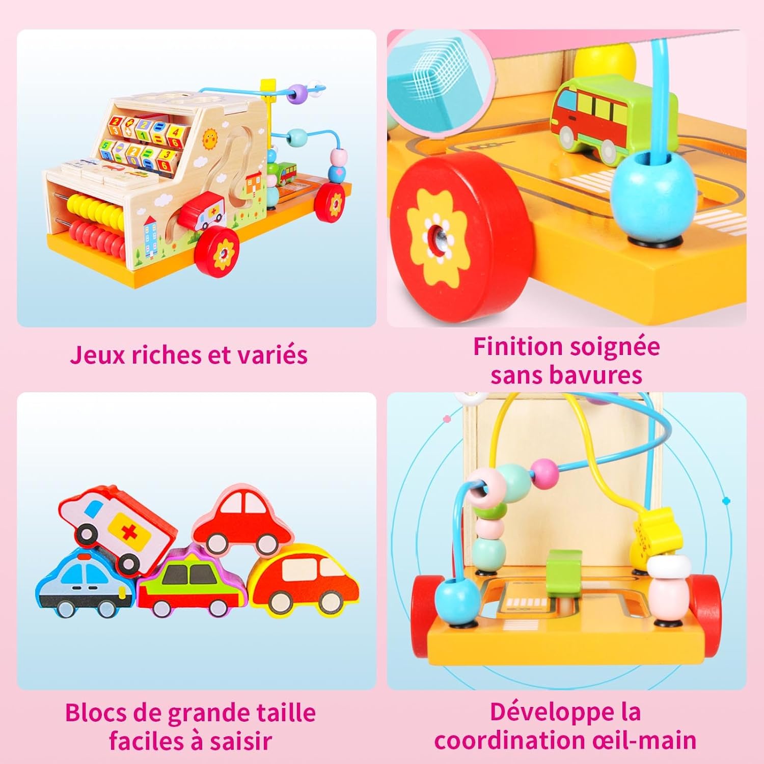 - Contenu : Une voiture multifonction, cinq voitures en bois et trois blocs carrés avec motifs colorés.