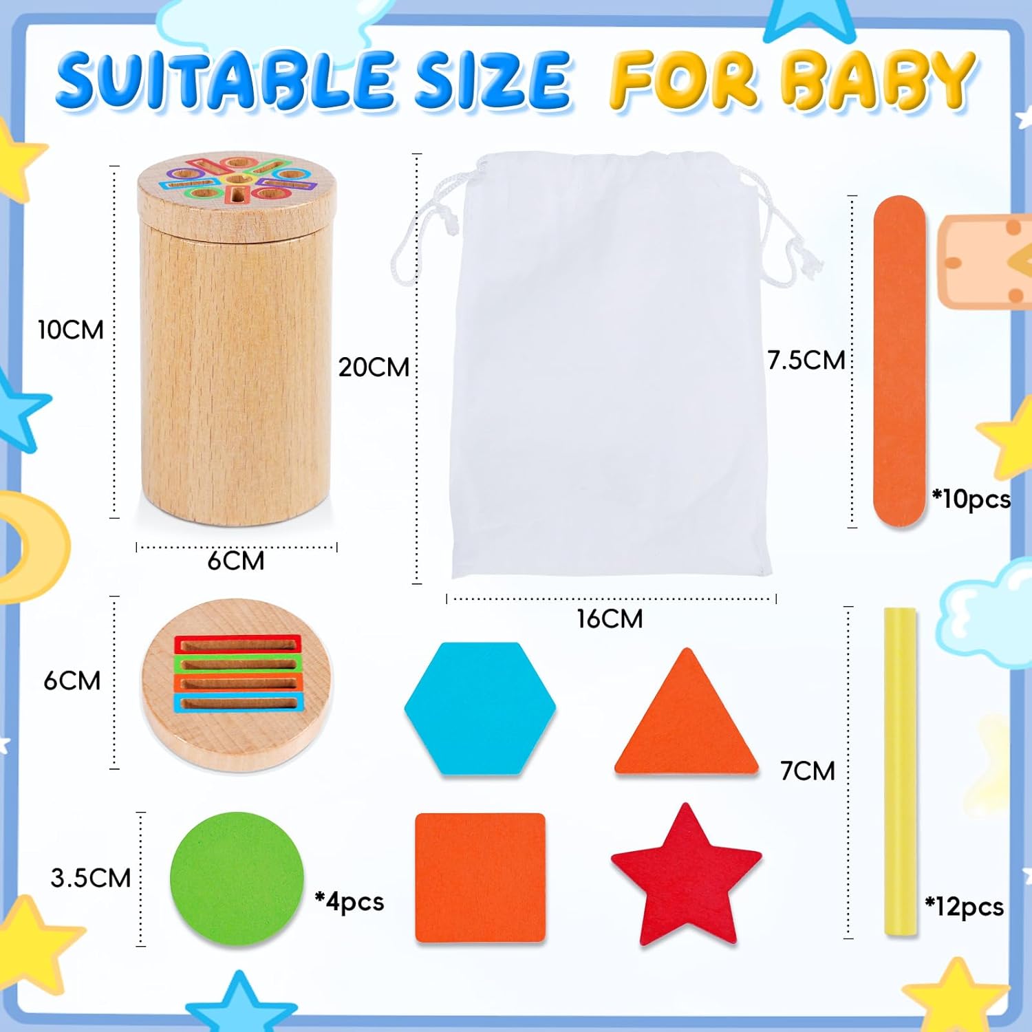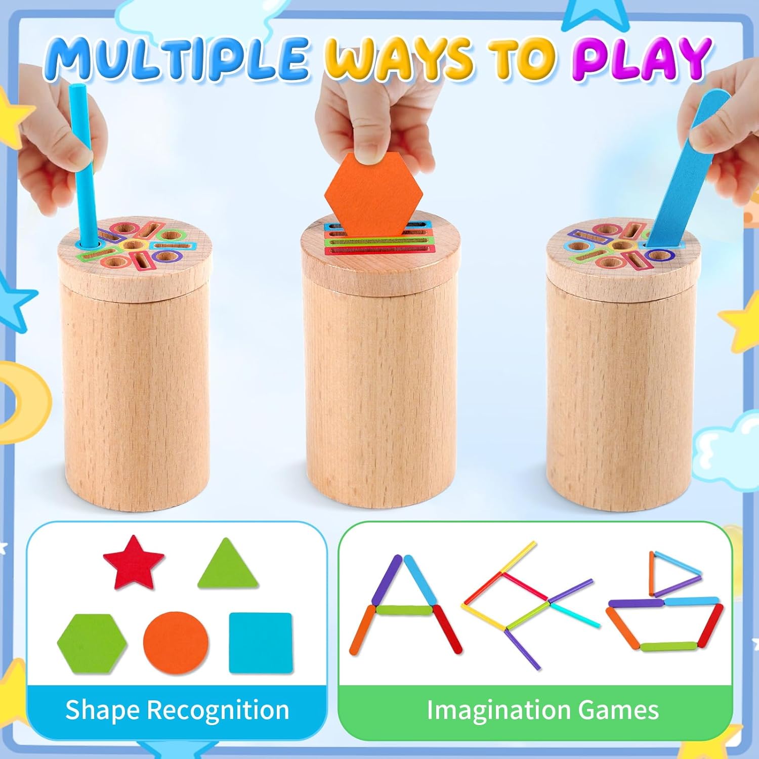 Ce jouet est idéal pour initier les tout-petits à la reconnaissance des formes et des couleurs. Avec cinq formes géométriques distinctes – cercle, carré, triangle, hexagone et pentagramme – et des blocs en bois colorés, votre enfant développera sa capacité à identifier et nommer ces éléments tout en améliorant sa concentration. Les activités d’empilage et de tri permettent également de renforcer ses compétences en résolution de problèmes.