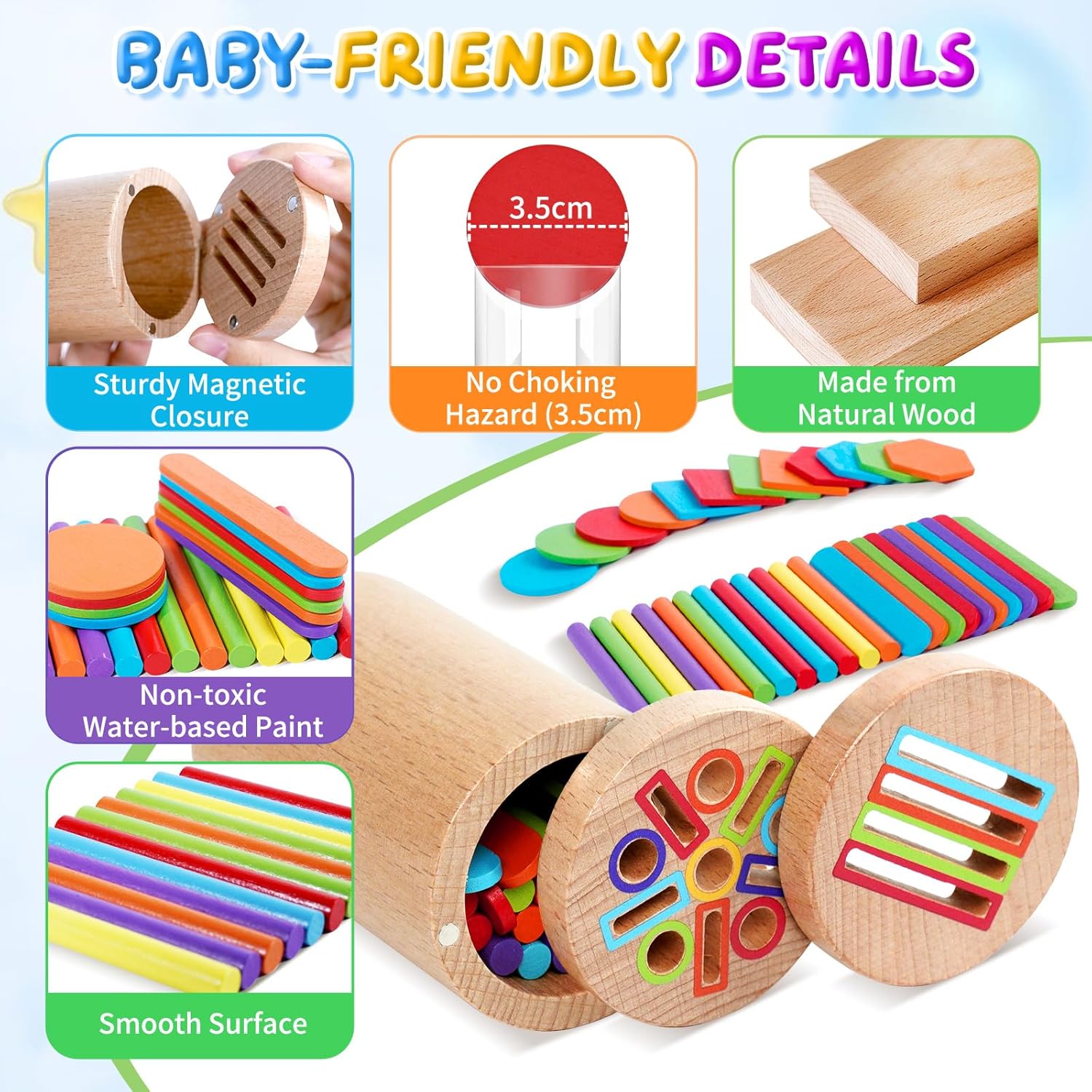 Fabriqué à partir de bois massif de haute qualité, ce jouet est conçu pour durer tout en garantissant une sécurité optimale. Chaque pièce est soigneusement poncée pour offrir une surface lisse et des bords arrondis, éliminant ainsi tout risque de blessure. Les peintures utilisées sont à base d’eau, non toxiques et inodores, assurant une utilisation sans danger pour les tout-petits. De plus, le seau est équipé d’un système magnétique sécurisé pour maintenir les pièces en place.