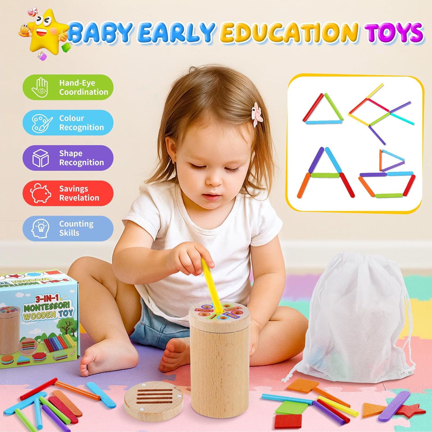Offrez à votre enfant de 1 à 3 ans un jouet Montessori 3 en 1 éducatif, conçu pour développer sa motricité fine, sa coordination œil-main et son imagination grâce à des activités de tri, d’empilage et de reconnaissance des formes et des couleurs.
