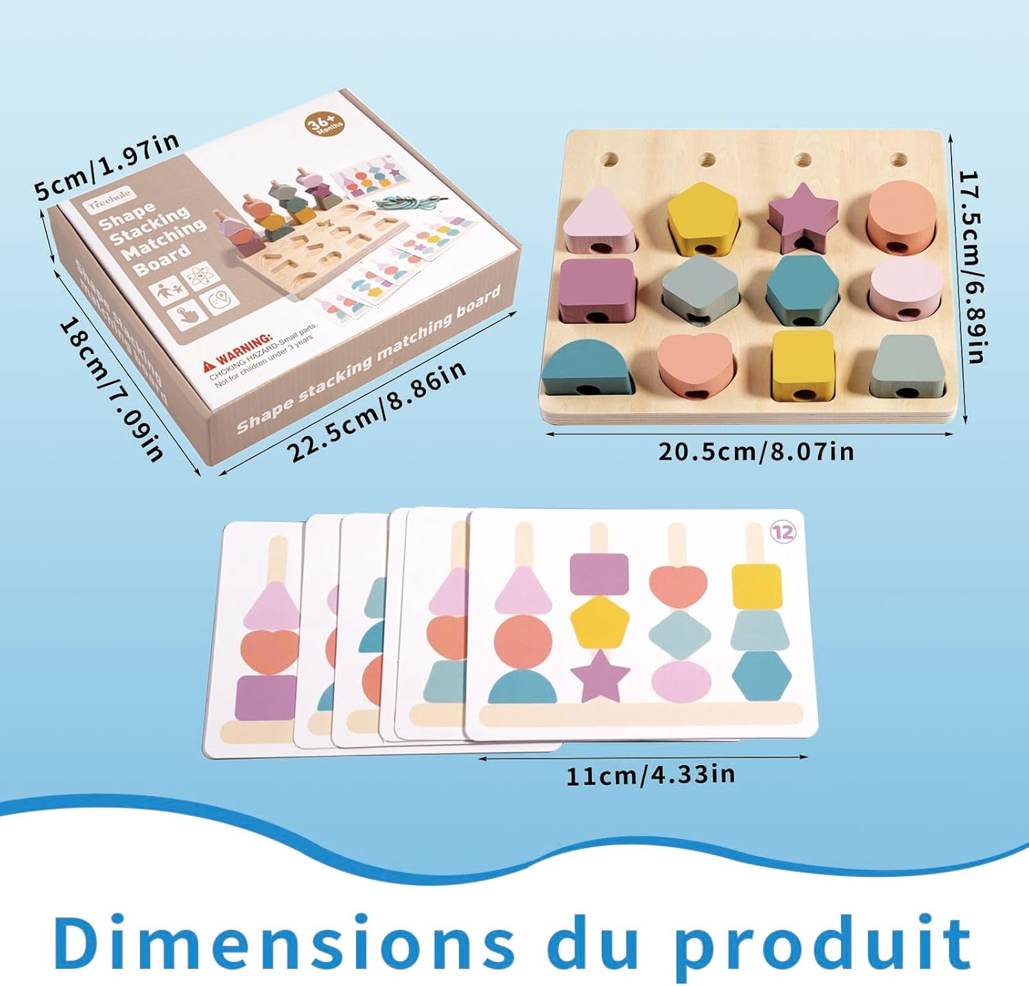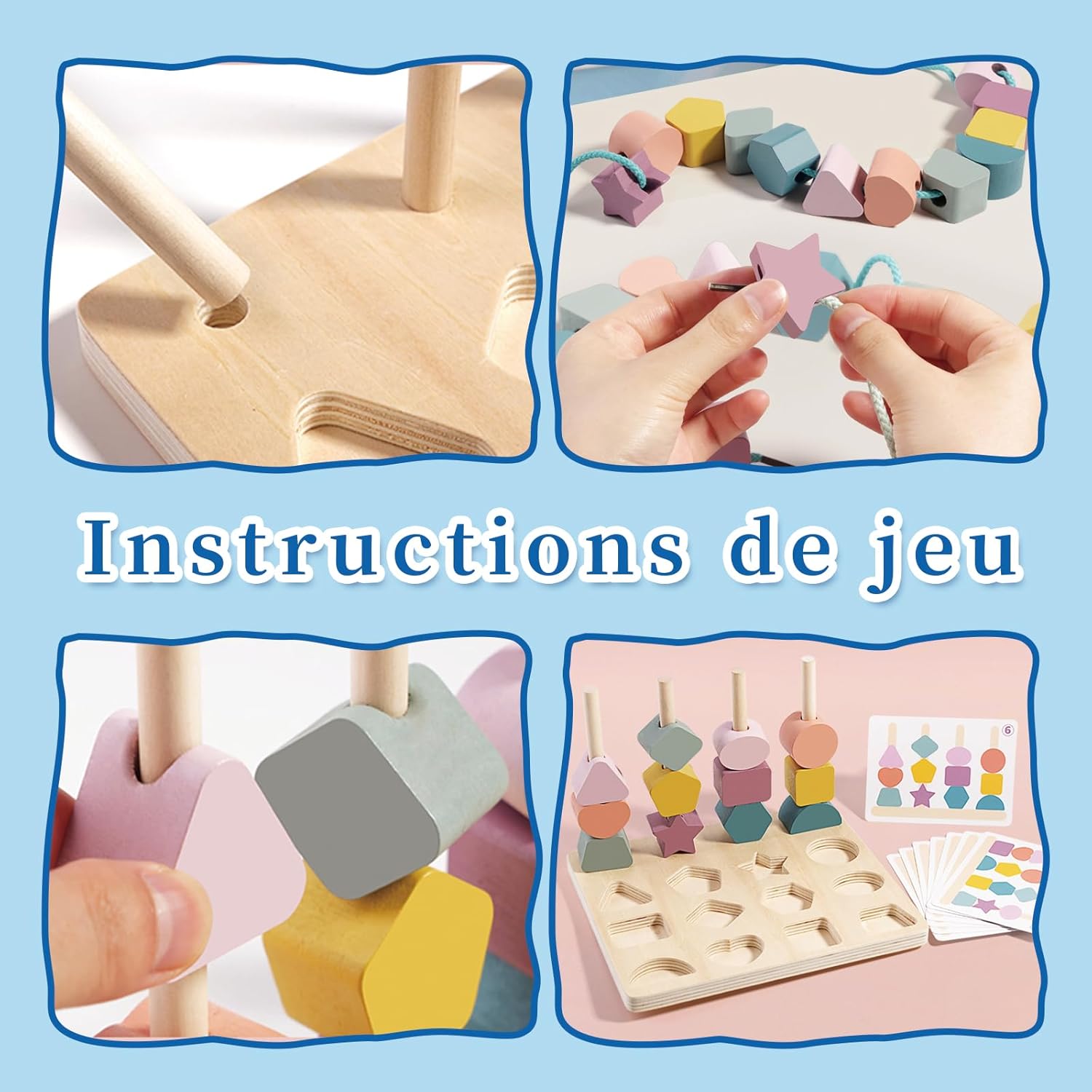 • Contenu : 12 blocs colorés, 4 tiges en bois, 1 base en bois et 1 corde à enfiler.