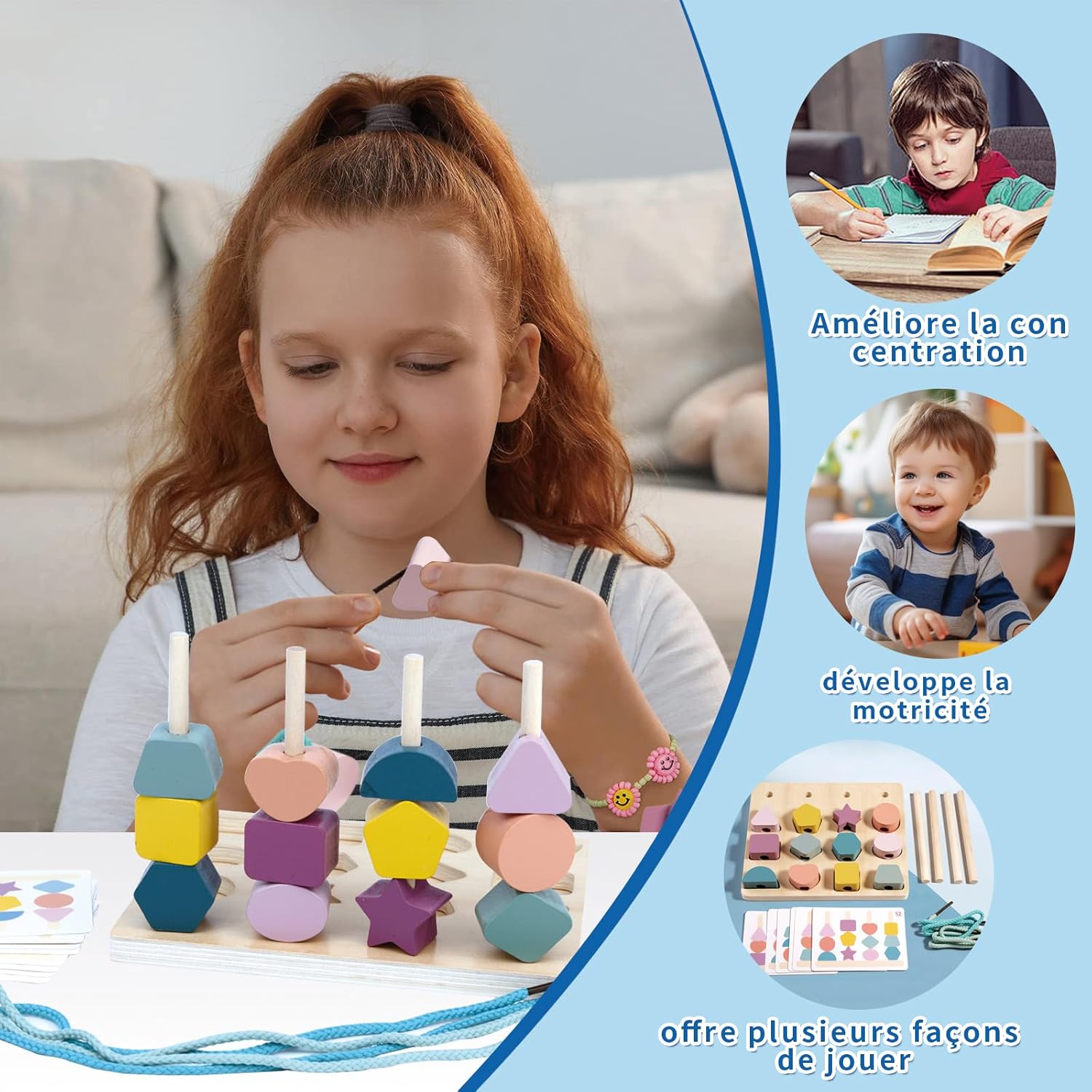 Offrez à votre enfant une expérience ludique et éducative avec ce jouet Montessori soigneusement conçu. Composé de 12 blocs aux formes variées, aux couleurs éclatantes, de 4 tiges en bois, d’une base en bois robuste et d’une corde à enfiler, ce jouet est parfait pour les enfants âgés de 2 à 5 ans. Il allie amusement et apprentissage, tout en stimulant leur curiosité naturelle et leur soif de découverte.