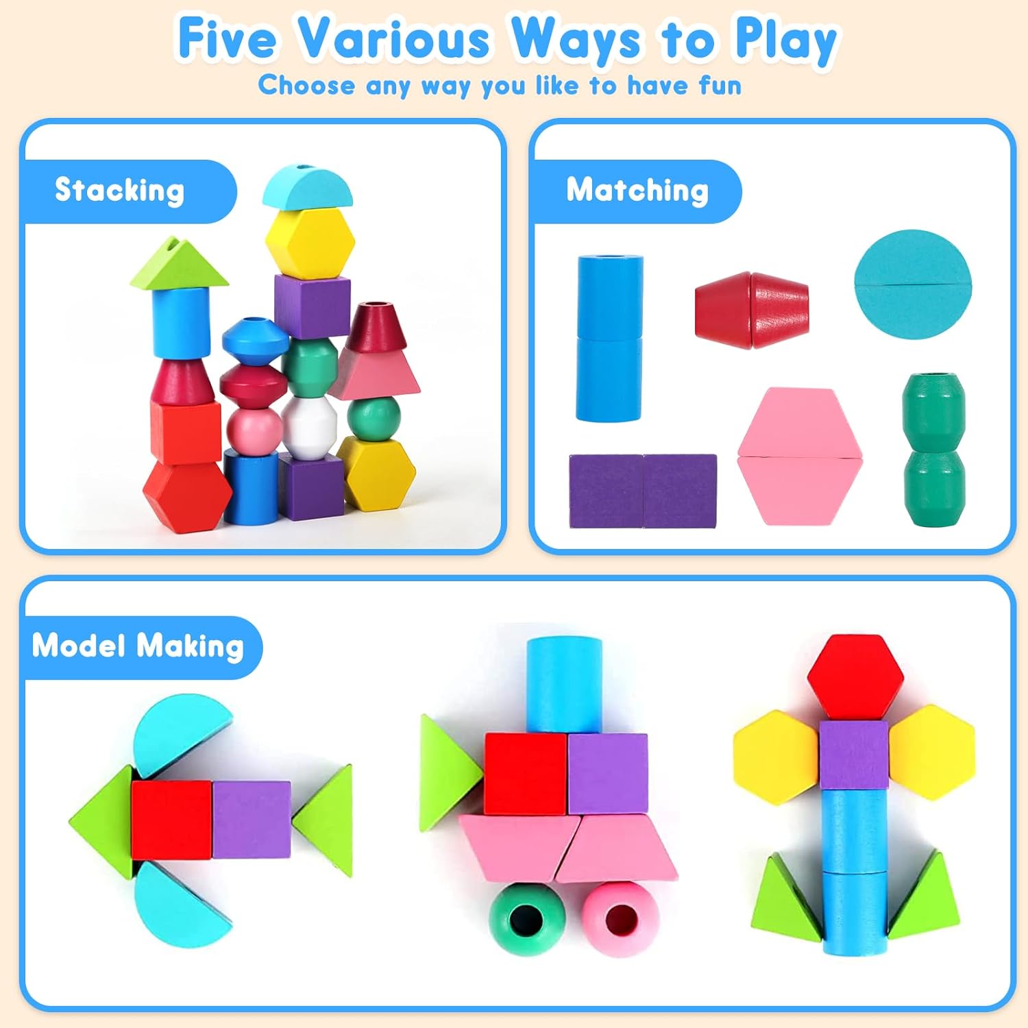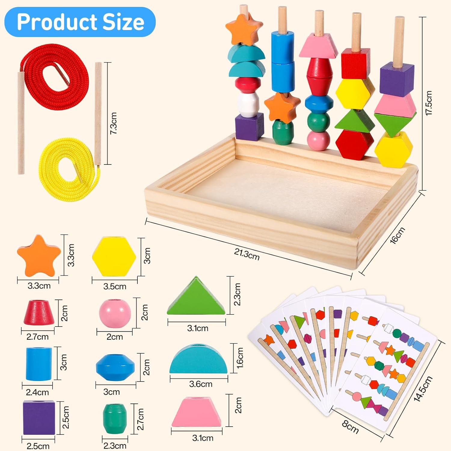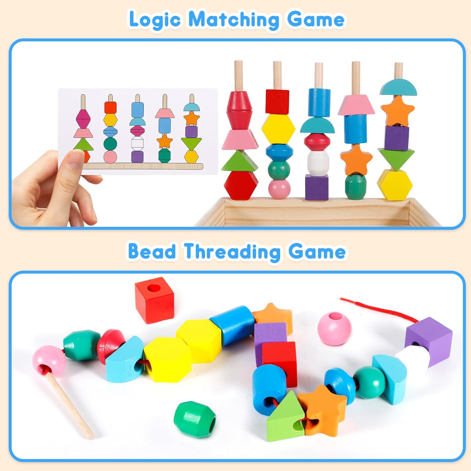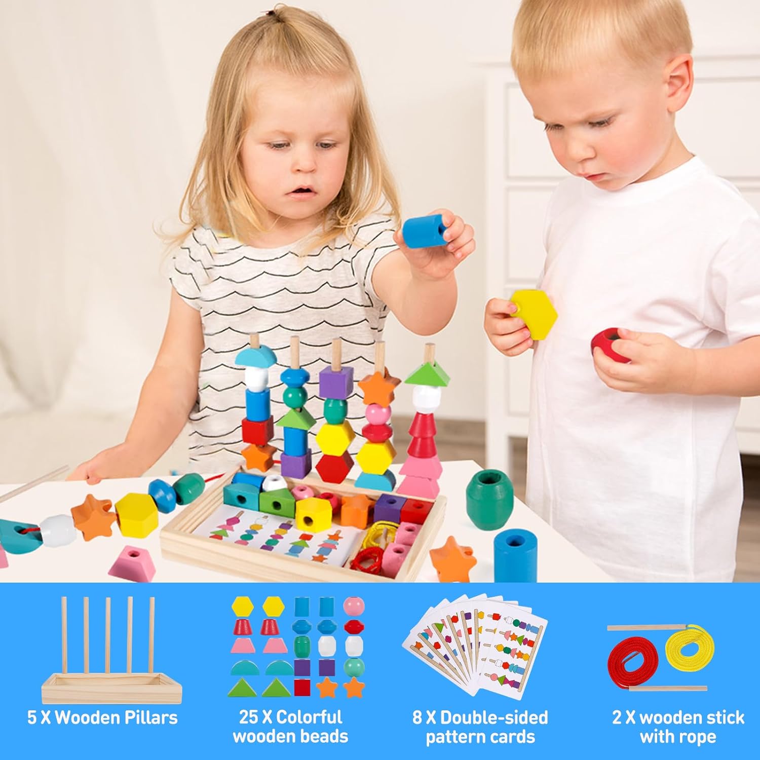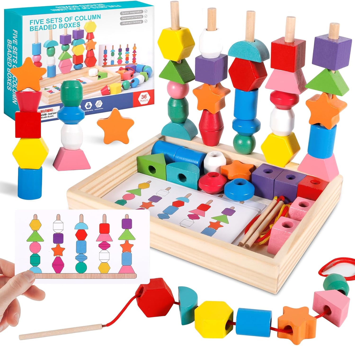 Avec cet ensemble multifonction, les possibilités sont infinies ! Les enfants peuvent s’amuser à attacher des perles avec les deux longues ficelles incluses, créer des modèles uniques, empiler les blocs ou encore associer différentes formes et couleurs. Le bâton en bois facilite l’enfilage des perles, rendant chaque activité accessible et agréable. Ces multiples options garantissent un divertissement sans fin tout en encourageant le développement global de l’enfant.