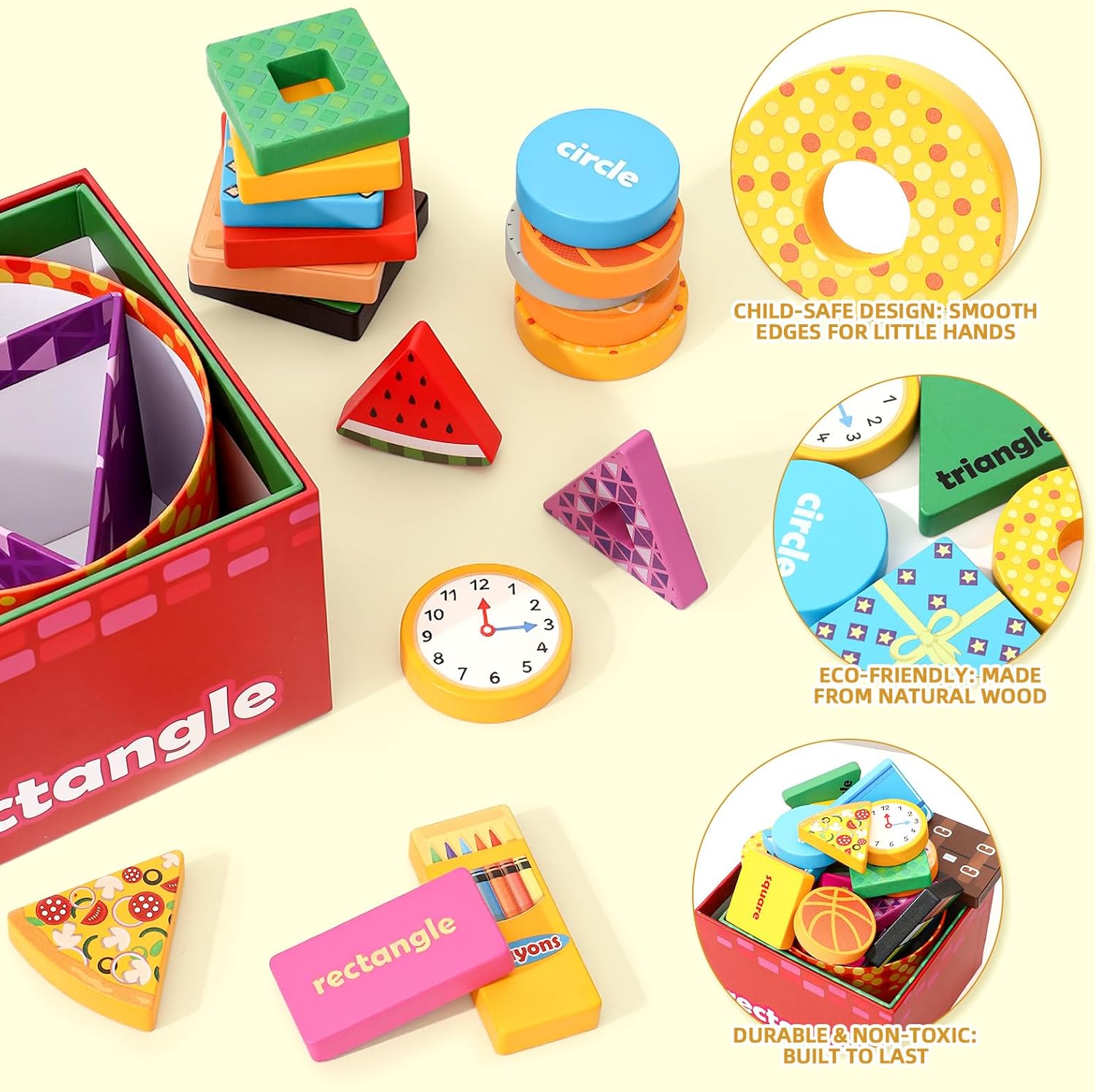 Ce jouet se compose de 4 boîtes de formes géométriques différentes – triangle, cercle, carré et rectangle – et de 4 types de blocs en bois, chacun décliné en 6 pièces. Les blocs sont inspirés d’objets du quotidien, comme une part de pizza triangulaire ou un ballon rond, ce qui rend l’expérience encore plus engageante et enrichissante. Chaque élément a été soigneusement conçu pour captiver l’attention des petits explorateurs tout en les initiant aux bases des formes et des tailles.
