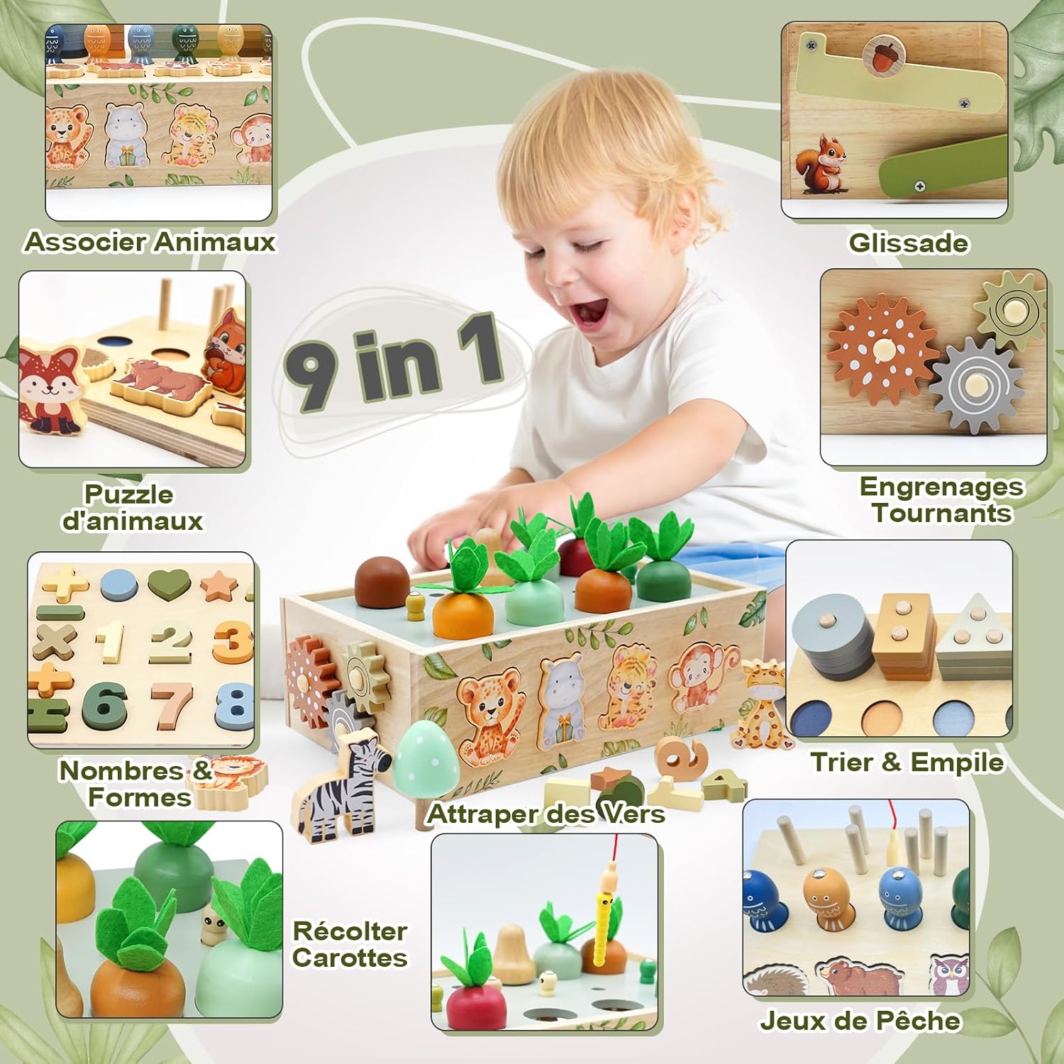 Stimulez les capacités cognitives et motrices de votre enfant dès le plus jeune âge grâce à ce jouet montessori en bois éducatif. Conçu pour les enfants de 1 à 4 ans, ce jouet 9-en-1 offre une expérience ludique et éducative complète, mêlant découverte, apprentissage et amusement. Sa conception soignée et ses multiples activités favorisent le développement global de votre tout-petit tout en lui procurant des heures de divertissement.