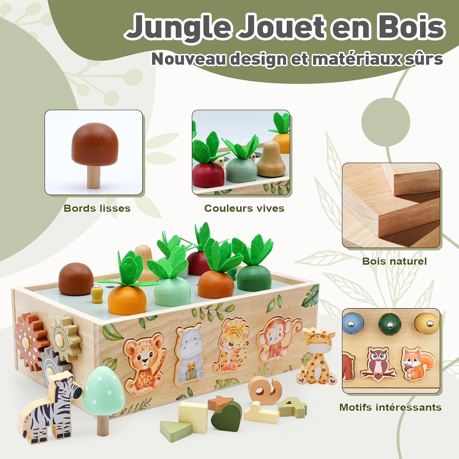 Dès l’âge d’un an, les enfants commencent à explorer le monde qui les entoure. Ce jouet montessori leur permet d’expérimenter des concepts essentiels tels que les tailles, les quantités et les associations. Avec des motifs inspirés du thème de la jungle, comprenant des animaux, des carottes, des champignons et bien plus encore, ce jouet attire l’attention et encourage une exploration ludique et éducative. Il aide également les tout-petits à développer leur motricité fine, leur coordination et leur capacité à résoudre des problèmes dès le plus jeune âge.