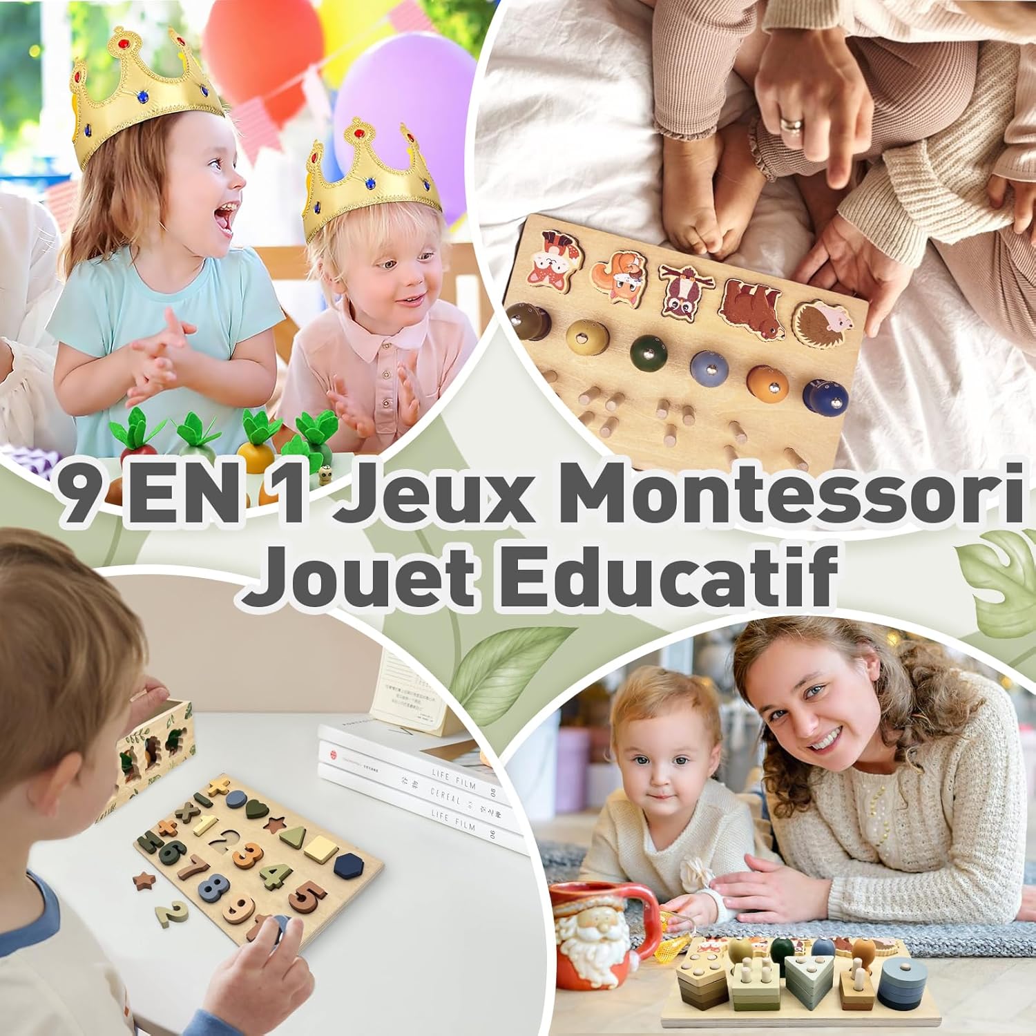 Offrez à votre enfant de 1 à 4 ans un jouet en bois Montessori 9-en-1, éducatif et sécurisé, qui développe la motricité fine, la logique et la créativité grâce à des jeux de tri, d’empilage et d’association.