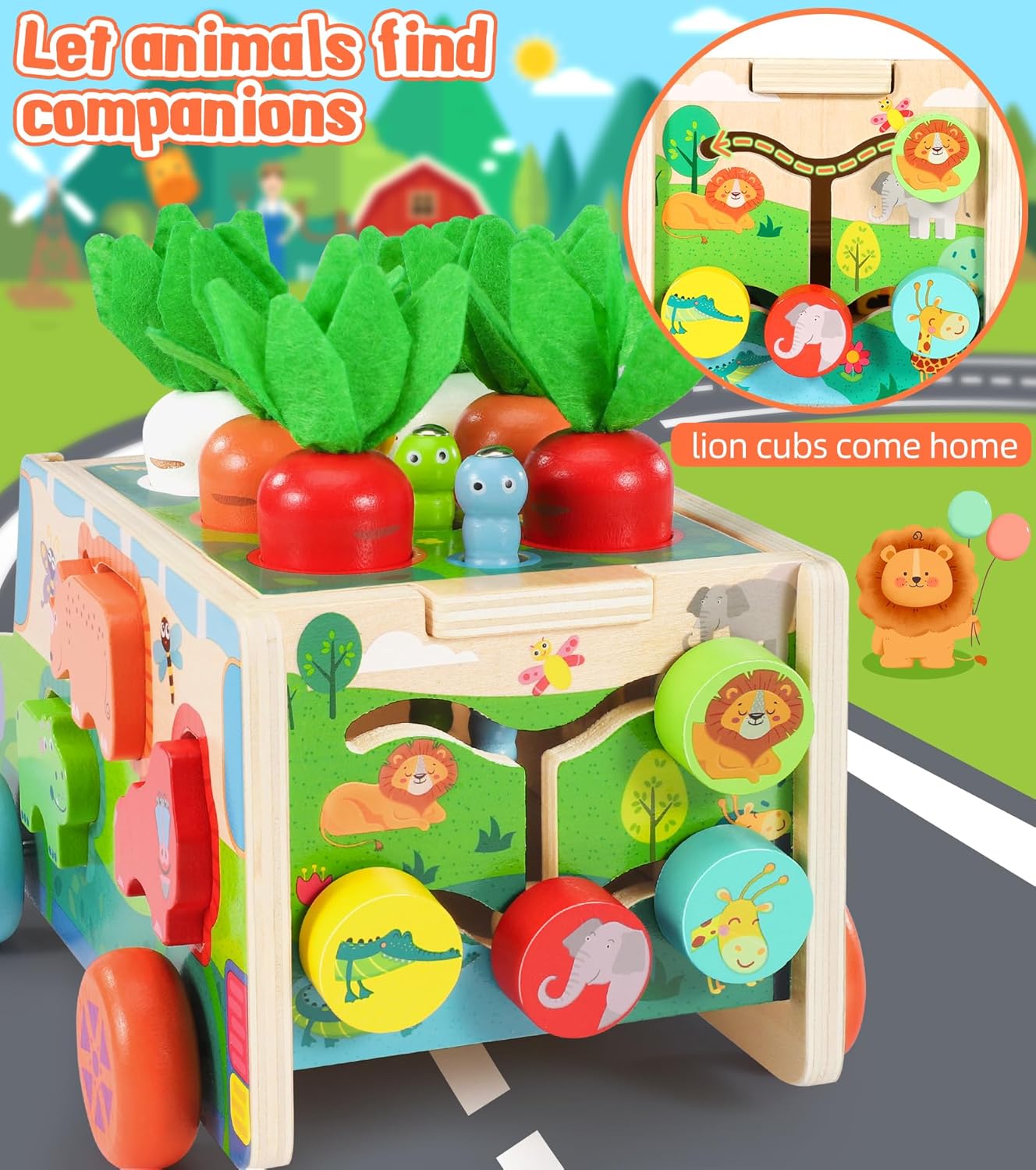 Jouer en bois en forme de bus avec différentes activités. Le bus roule. Il possède deux petits personnages que l’on peut glisser à l’avant du bus pour jouer à le faire rouler dans un premier temps. Vous avez donc différentes activités sur le bus, une activité d’attrape, carottes et attrape asticot grâce notamment aux petits personnages. Un jeux de puzzle avec des formes d’animaux, sur les deux côtés du bus à l’arrière, vous avez un jeu de petits pions à déplacer pour développer la dextérité fine. Un très bel ensemble de jeux en bois de qualité sans aspérité avec de belles couleurs. C’est un jeu qui plaira aux enfants comme aux parents la qualité est bien présente aucun défaut sur le jeu. Les couleurs sont attrayant pour les tout petits.
