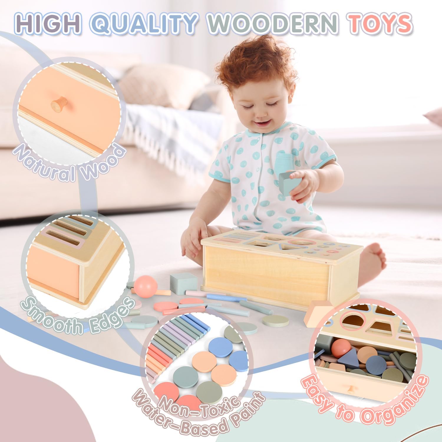 Fabriqué à partir de bois naturel de haute qualité, ce jouet Montessori garantit une expérience de jeu en toute sécurité. La surface lisse, sans bavures, et les bords arrondis des éléments en bois assurent un contact doux et agréable pour les petites mains. La peinture utilisée est à base d’eau, non toxique et sans odeur, répondant ainsi aux exigences des parents soucieux de la santé et du bien-être de leur enfant.