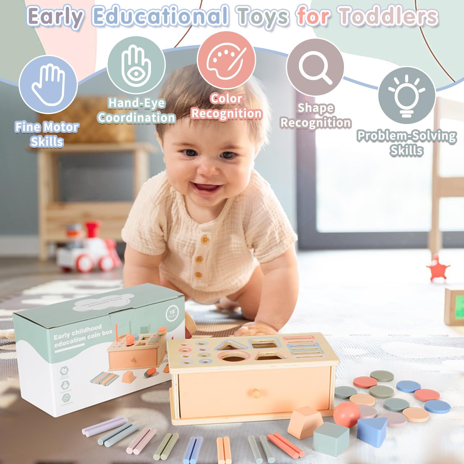 Très beau jeu 2 en 1: encastrement et tri des couleurs. L’enfant s’entraîne à encastrer les différentes formes dans les fentes, tout en respectant les couleurs. La taille du jeu est largement suffisante. Les couleurs pastels sont très belles et résistantes. Le bois est de très bonne qualité.