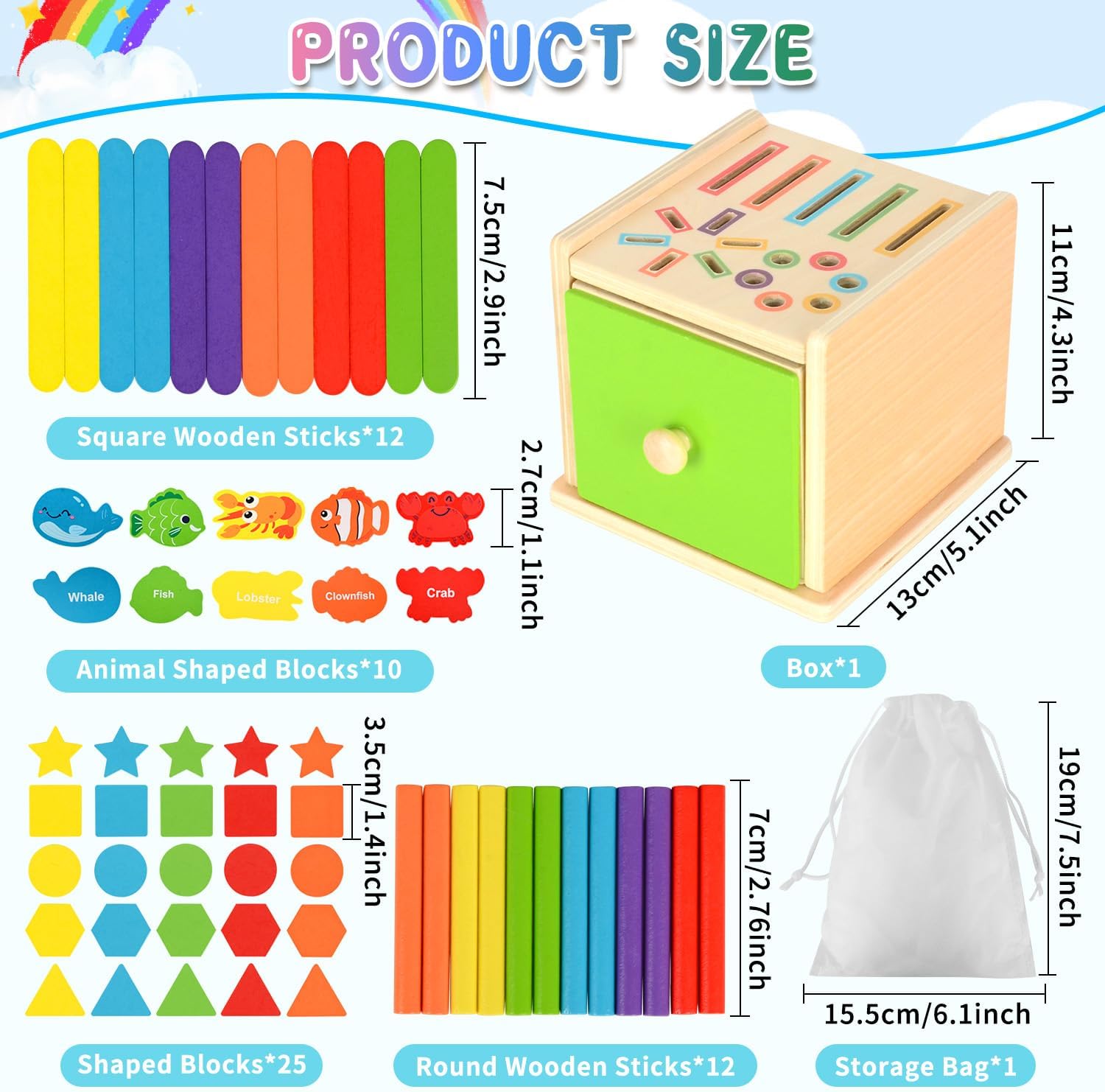 - 12 bâtonnets ronds et 12 bâtonnets carrés pour apprendre à différencier les formes géométriques.