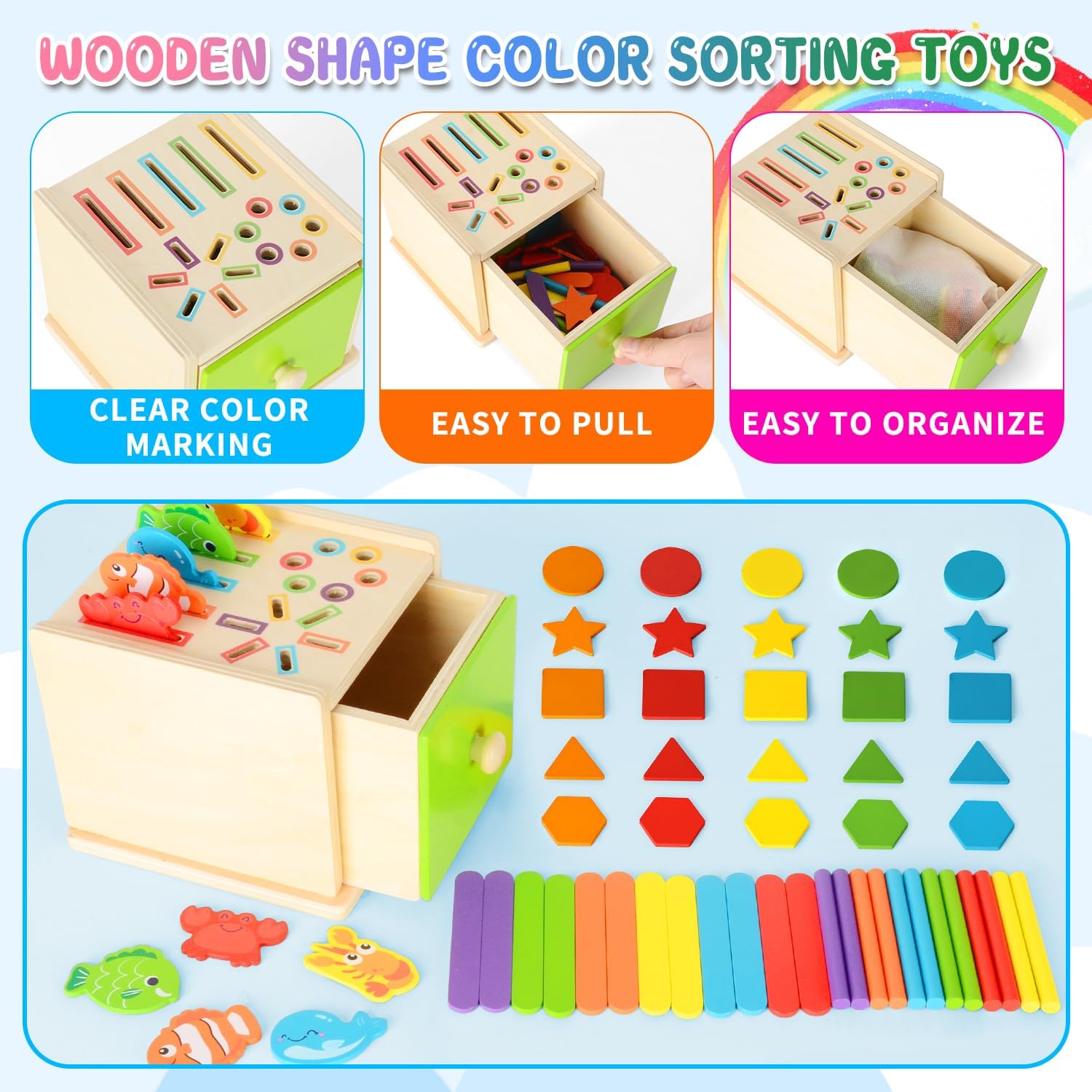 Un jeu en bois de diverses activités élaboré selon la méthode Montessori très bien pour l'éveil ludique de l'enfant. Il y a plusieurs formes différentes à encastrer comme des bâtonnets, des formes géométriques et des petits animaux de la mer. Une fois fini de jouer l'enfant peut les ranger dans la pochette et les mettre dans le tiroir de la structure. Les couleurs sont très gaies et les finitions bien finies et arrondies pour ne pas blesser les enfants, je recommande.