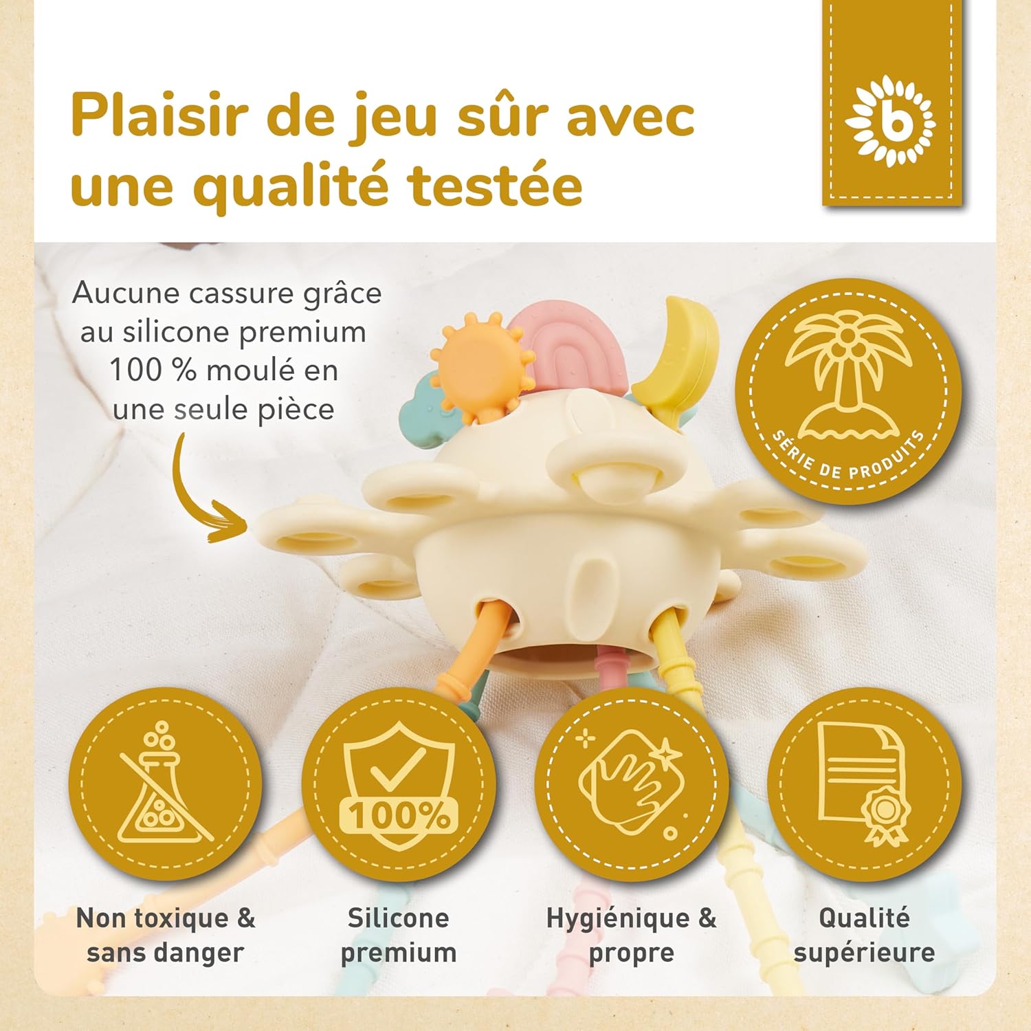 Fabriqué à partir de **silicone de qualité alimentaire**, ce jouet garantit une sécurité optimale pour votre bébé. Sans BPA, ni phtalates, il offre un jeu sain et sans danger. Résistant et durable, il accompagne les explorations répétées de votre enfant tout en préservant son intégrité au fil du temps.