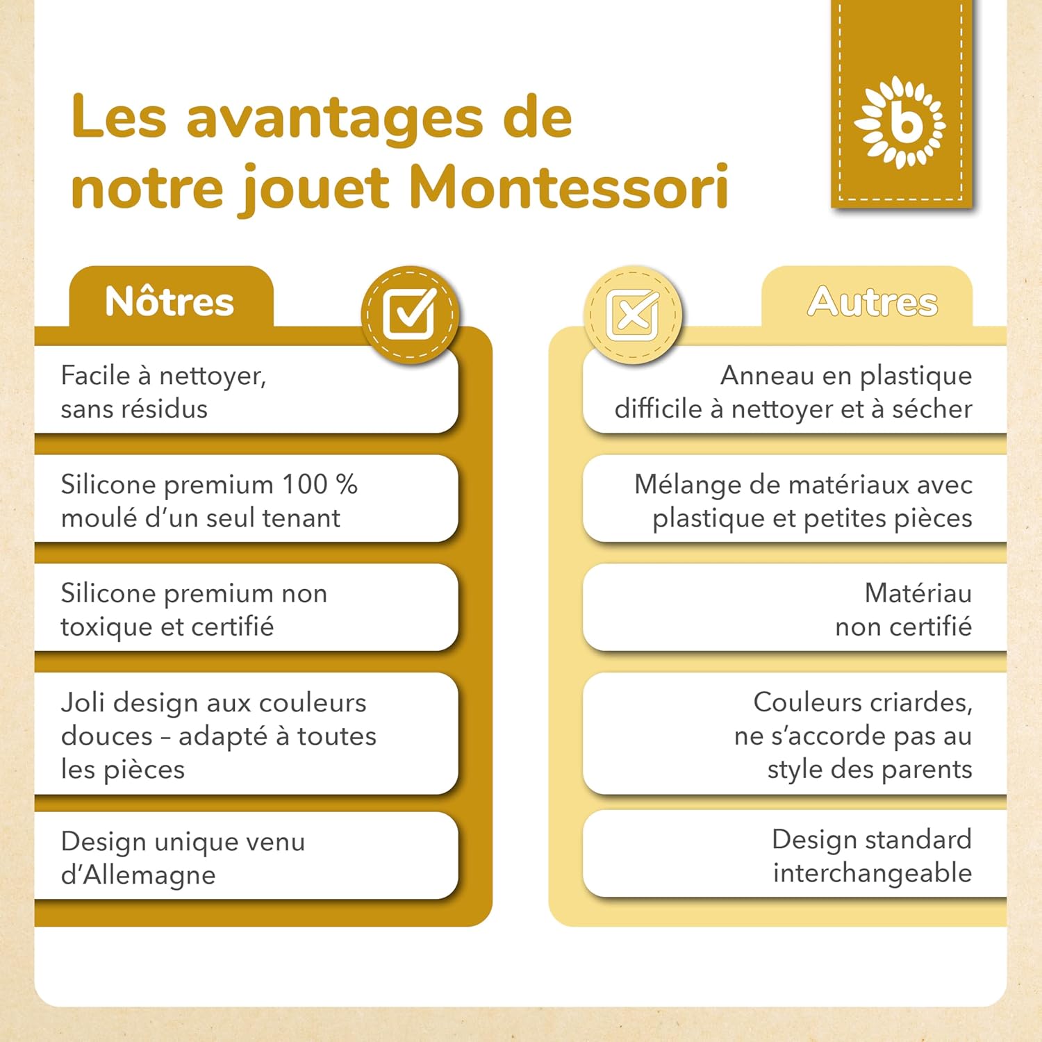 Adoptez ce jouet Montessori en silicone pour offrir à votre bébé un compagnon de jeu éducatif et sûr qui favorisera son développement tout en éveillant sa curiosité naturelle.