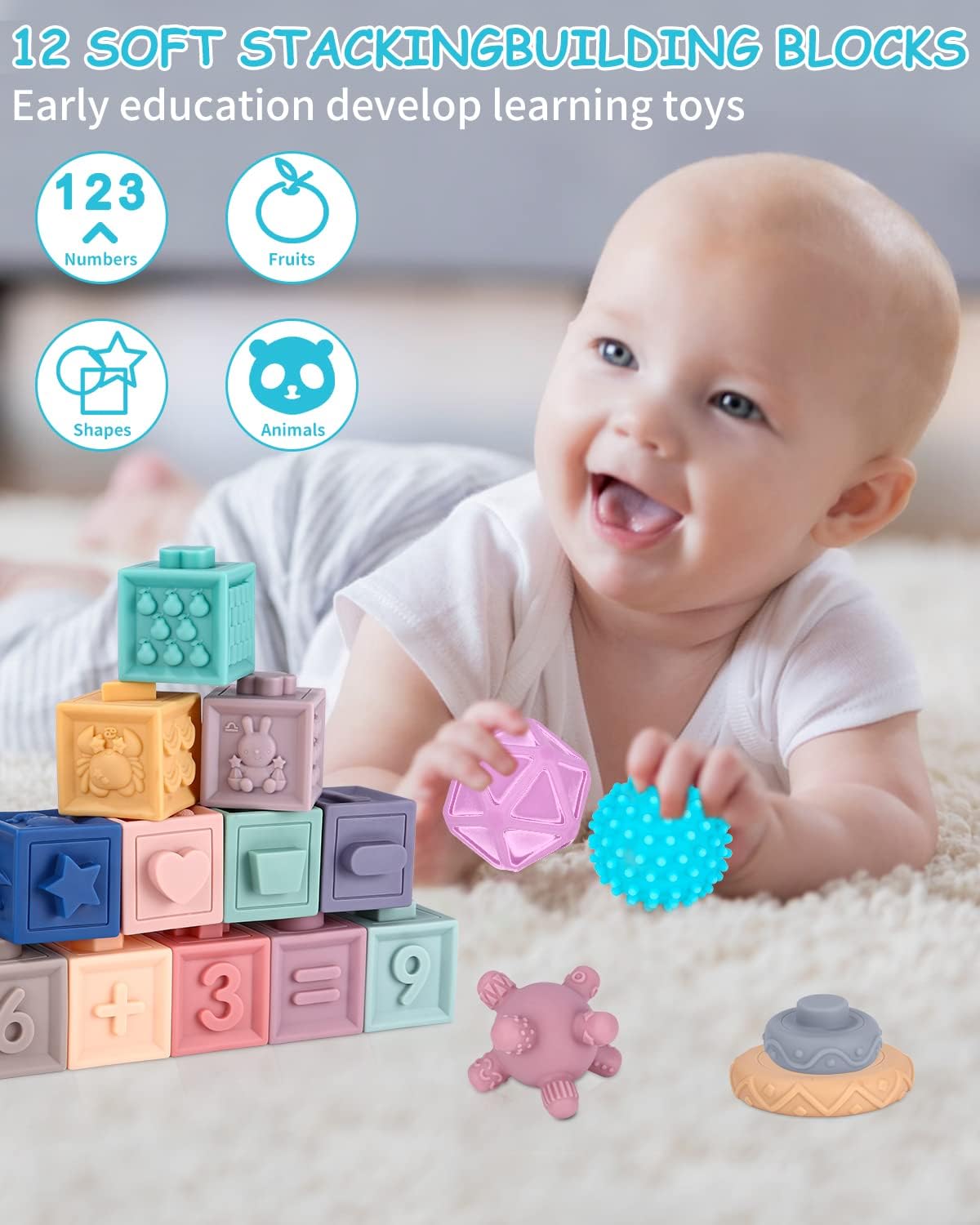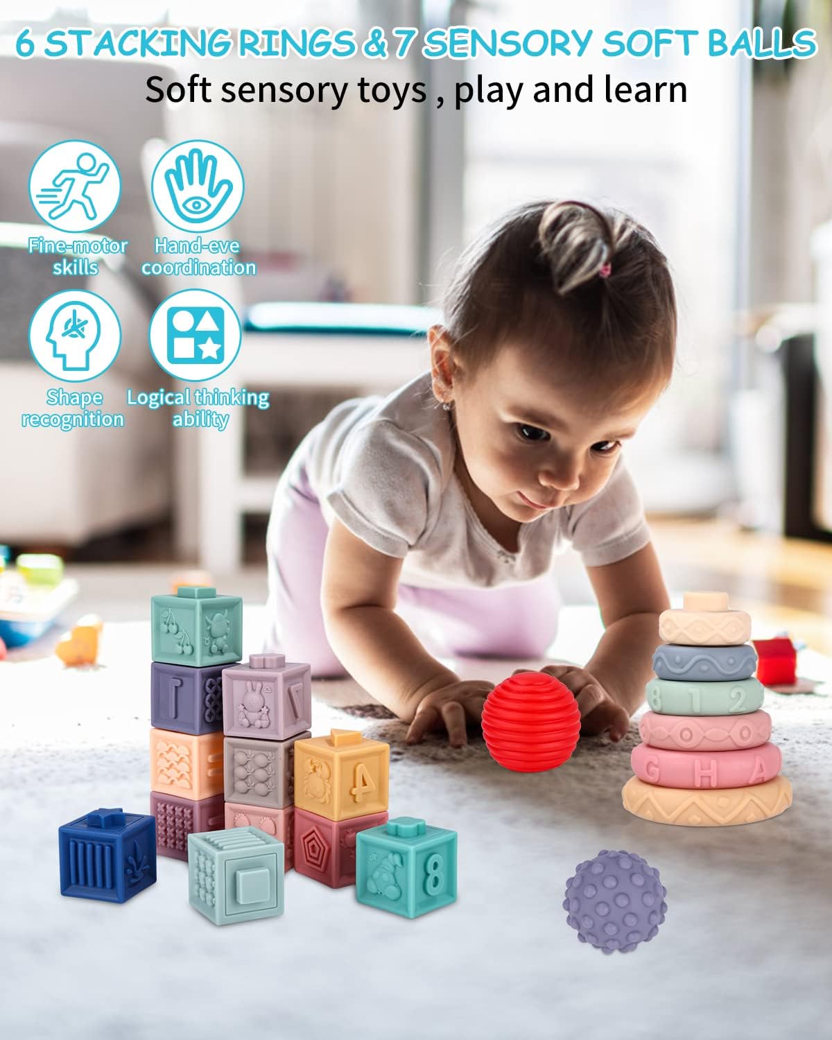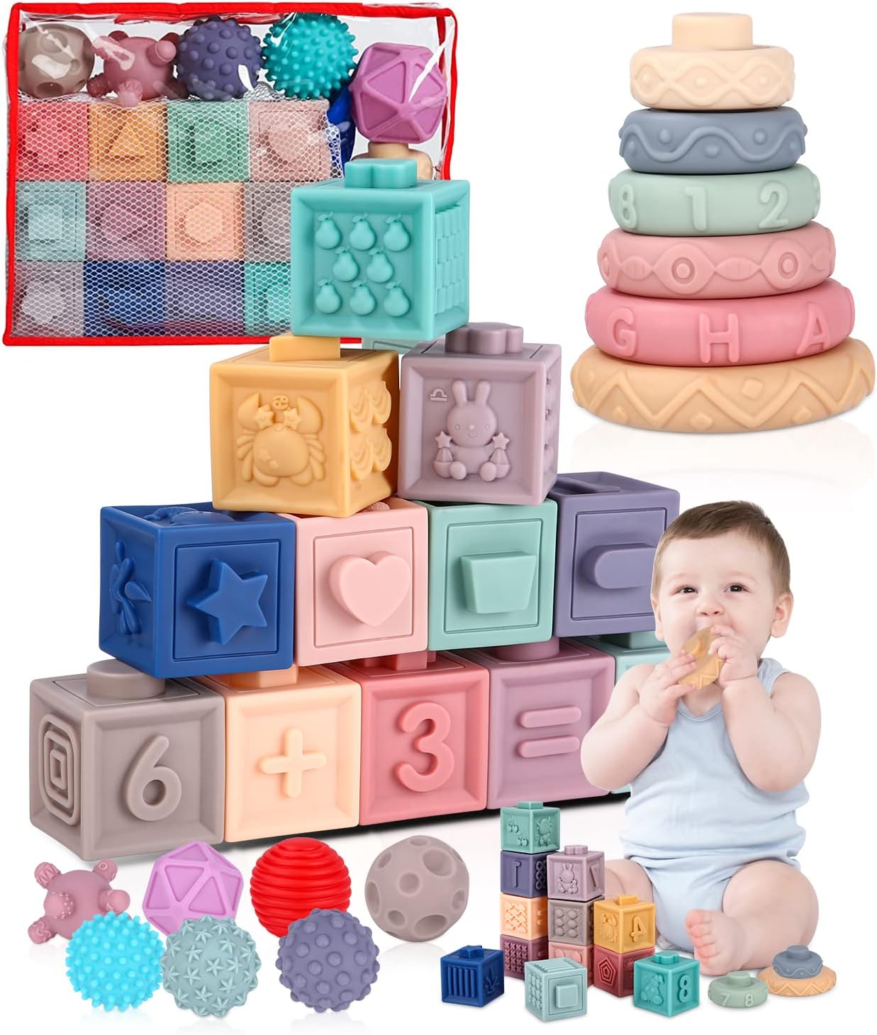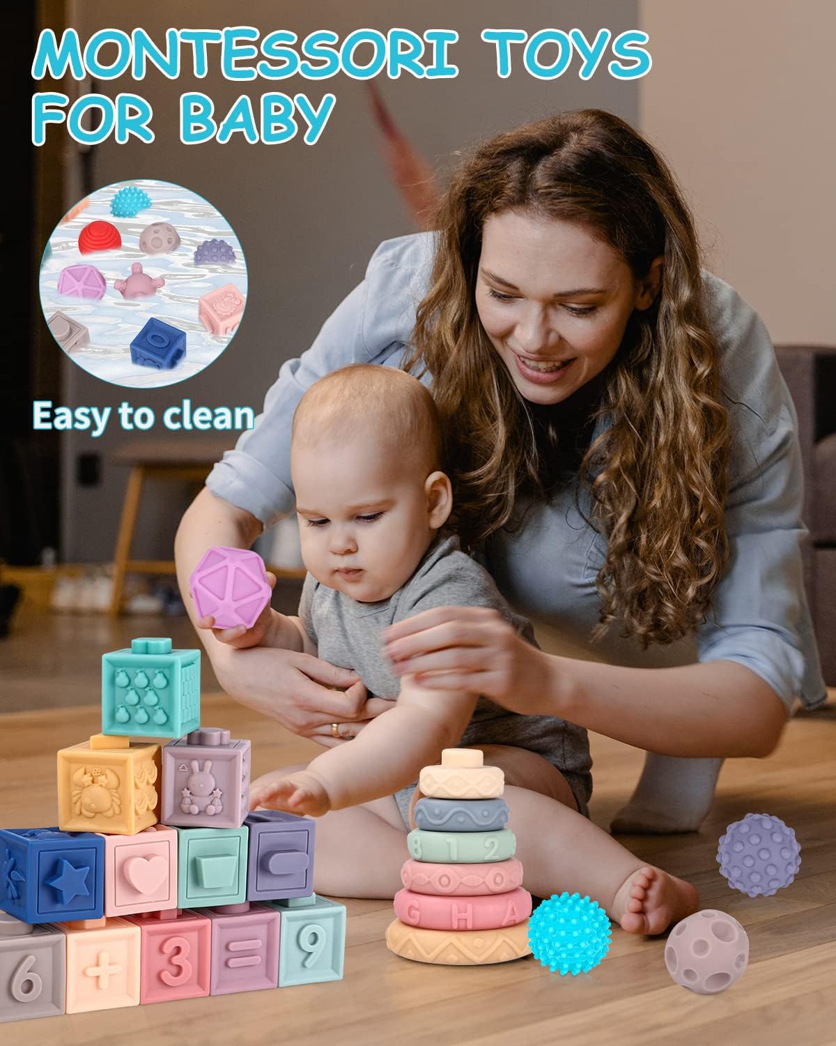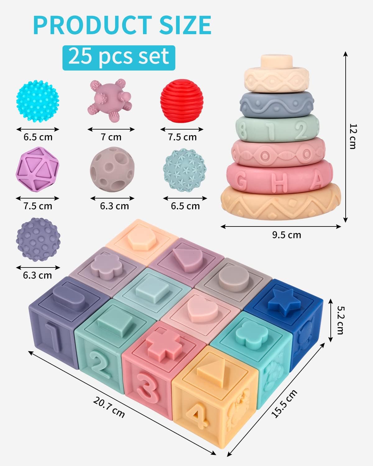 Éveillez les sens de votre bébé dès 6 mois avec ce jouet Montessori sensoriel comprenant 25 pièces éducatives sûres et colorées, idéales pour stimuler la motricité, les capacités cognitives et apaiser les poussées dentaires.