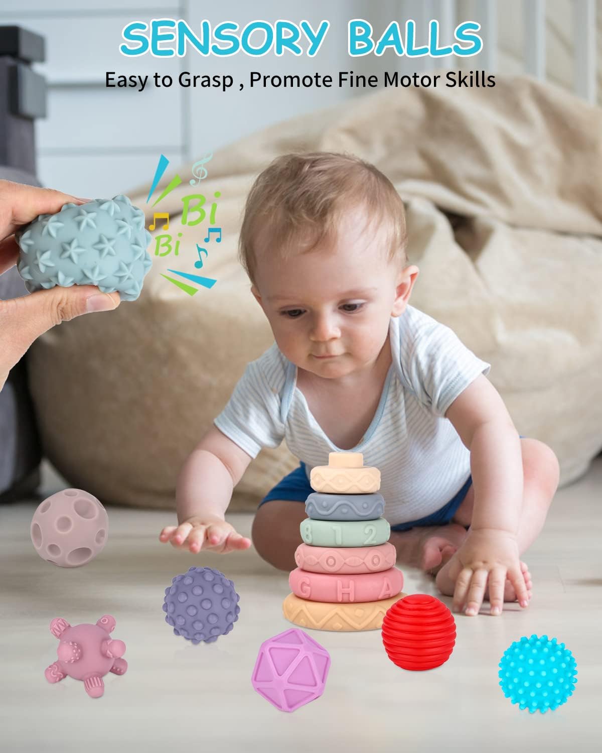 - 7 balles sensorielles douces, idéales pour apaiser les poussées dentaires et stimuler le sens du toucher grâce à leurs motifs en relief et leur texture agréable.