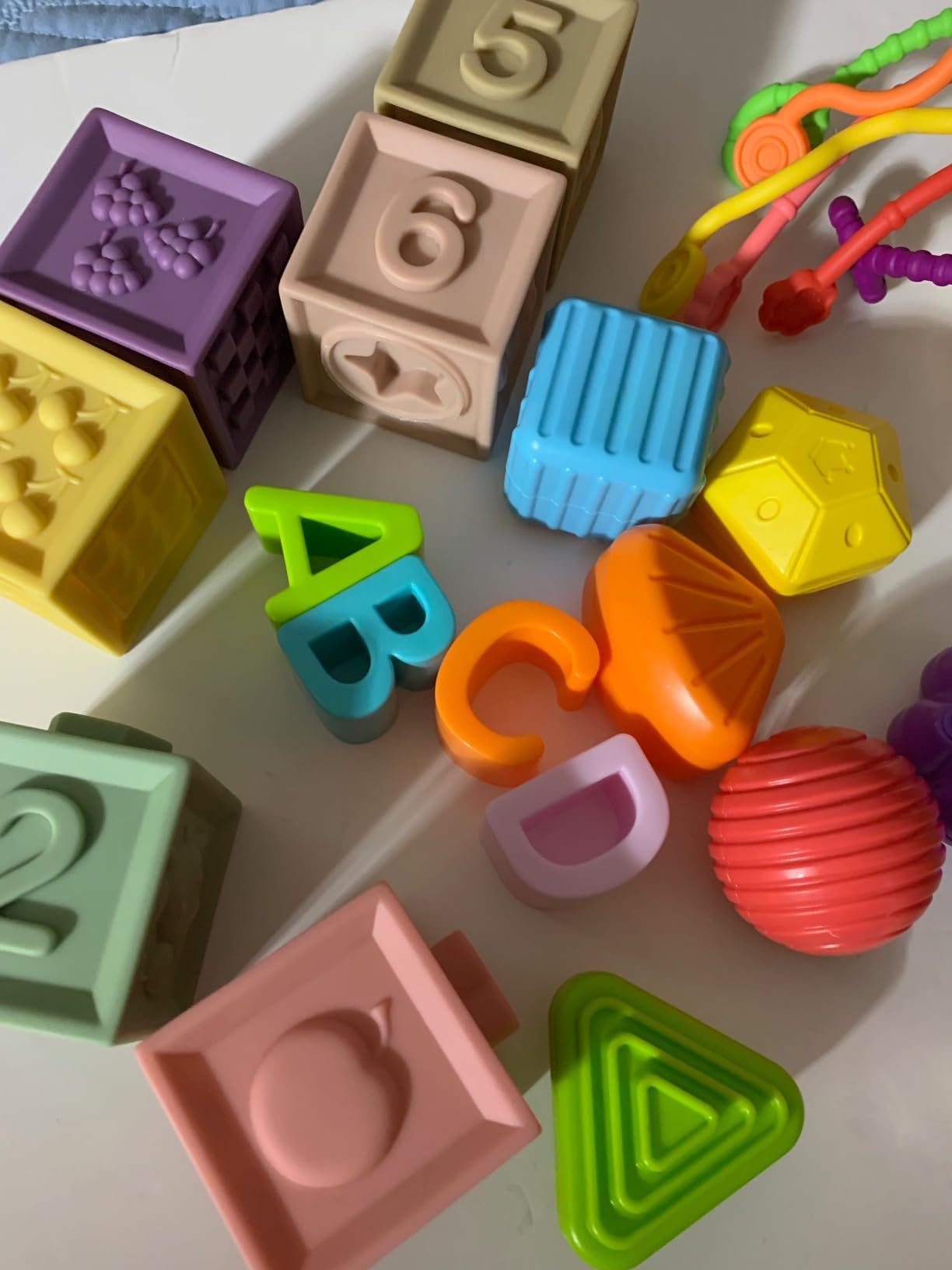 Cet ensemble comprend 17 pièces qui favorisent diverses compétences de développement. Les blocs de construction souples, les tasses empilables, les jouets à ficelle et les trieformes stimulent la reconnaissance des couleurs et des formes, les compétences de tri, la coordination main-œil, les compétences motrices et le développement cognitif.