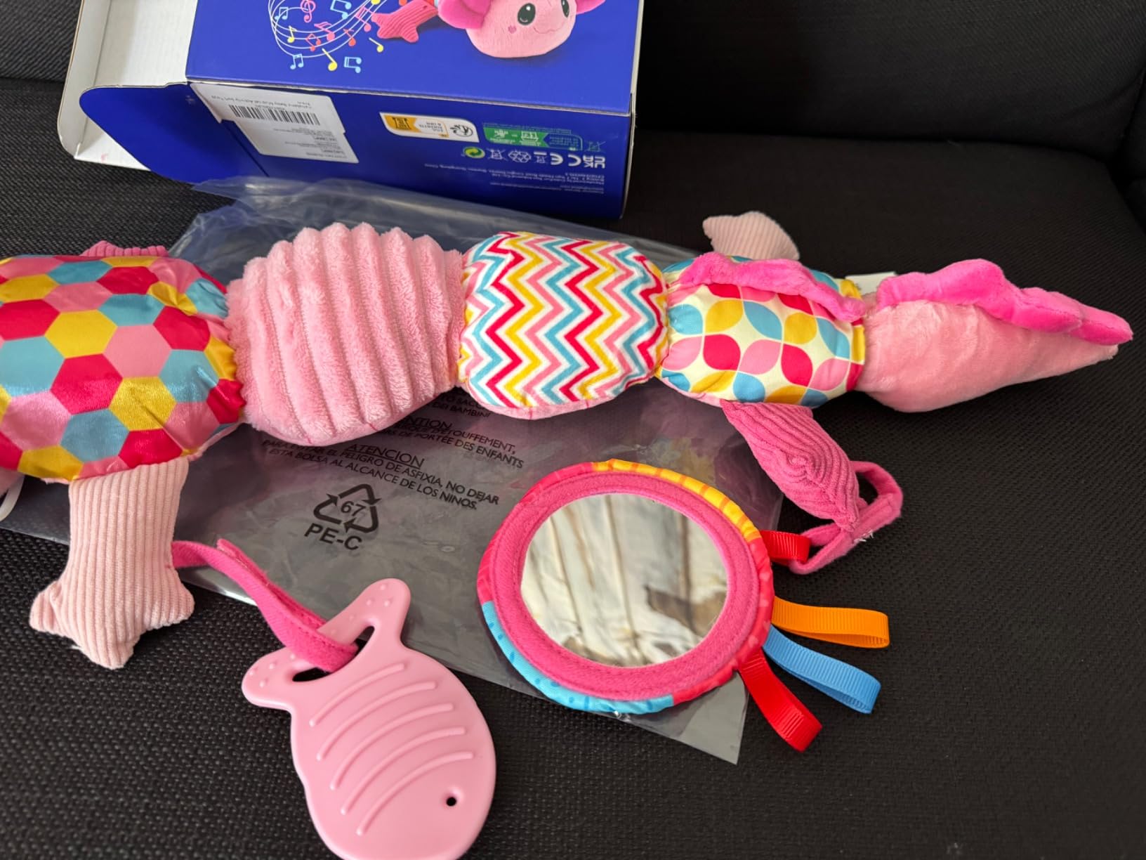 Trop choupinou,en rose ... Il ya un petit miroir un anneau de dentition ainsi que des froissements et des bruissements que ma fille raffole entendre!!!! Quand on appuie sur son ventre il ya une mélodie musicale ... Très ludique pour les enfants!!! Je recommande +++ idéal pour offrir aussi