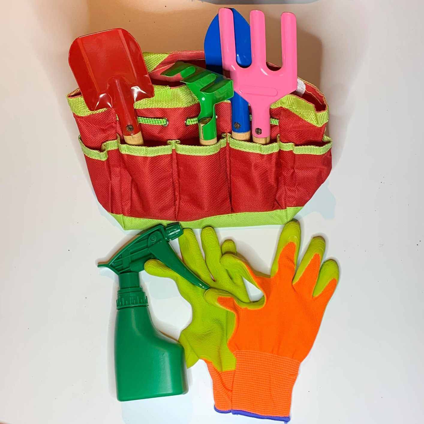 Un ensemble de jardinage pour enfants. Il y a une sacoche en toile qui se tient par 2 anses, elle a plein de poches sur le devant et permet de transporter tous les accessoires. A l'intérieur nous pourrons y trouver un petit râteau, une petite pelle, une petite truelle, un petit râteau trident, un spray et une paire de gants. La paire de gants est très bien, ce sont des gants souples qui permettent à l'enfant d'avoir des mouvements libres sans avoir les mains comprimées. Ils peuvent manipuler les petits outils et la terre sans difficultés. Les outils sont bien, il sont solides avec des manches en bois et des têtes en métal mais il faudra tout de même faire attention même s'ils ne sont pas pointus ou tranchants des enfants peuvent tout de même se faire mal avec. Le spray est facile à remplir et fonctionne bien. C'est un kit qui plaira beaucoup aux enfants pour jardiner avec leurs parents ou grands parents en faisant comme eux. Les couleurs sont neutres, il pourra être offert à une fille ou un garçon.