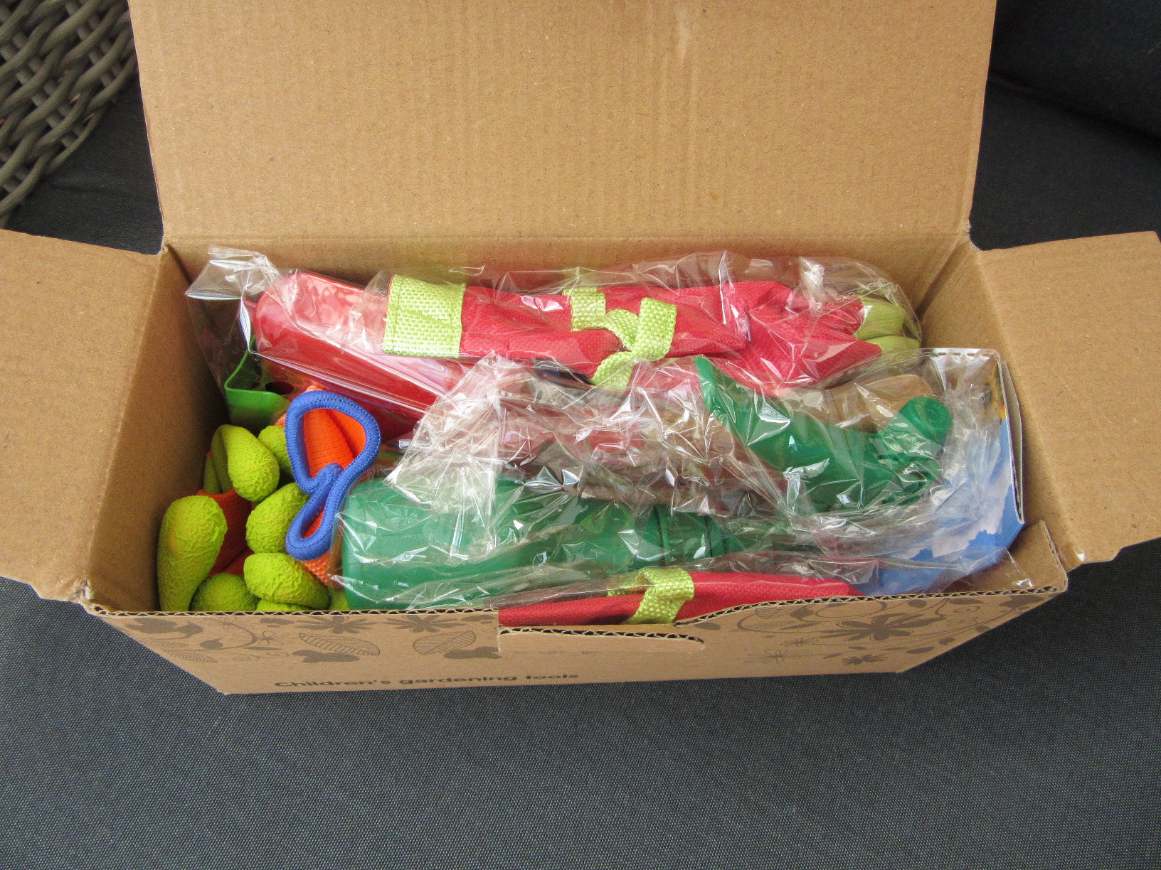 Un ensemble d’outils de jardinage très gai, les couleurs sont vives et chatoyantes qui donnent envie de s'en servir. Il est très complet, il permet à l’enfant de faire pratiquement l’ensemble des gestes de jardinage que font les adultes. Les 4 outils râteau, pelles, sont en acier. Bien que les bouts soit ronds, je suis assez réservé sur les possibles blessures, que peuvent provoquer les bords de ces outils en cas d’énervement de l’enfant, sur son petit frère ou petite sœur ou autre copains. En dehors de cela vraiment bien et à voir avec le temps si les outils ne vont pas trop rouiller une fois la peinture écaillée.