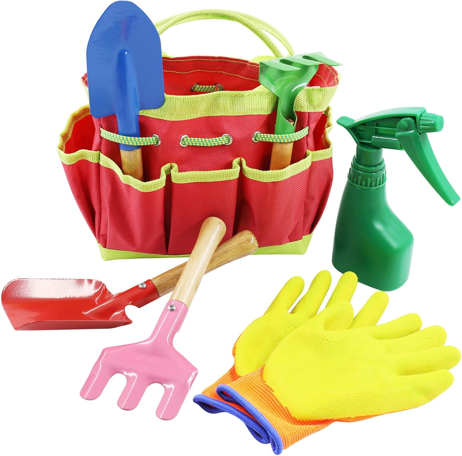 Ce pack contient tous les outils nécessaires pour un jardinier débutant ! Il y a même une paire de gants, plutôt de taille 10 ans je dirais. Les outils sont en bois et en métal. La qualité est convenable tant qu’on ne force pas trop avec. Les outils peuvent être rangés sur la périphérie du sac avec les liens, ou à l’intérieur (tout peut rentrer). Le pulvérisateur a une petite contenance mais est sans doute l’accessoire le plus amusant. L’ensemble est complet. J’ai seulement une réserve sur la longévité.