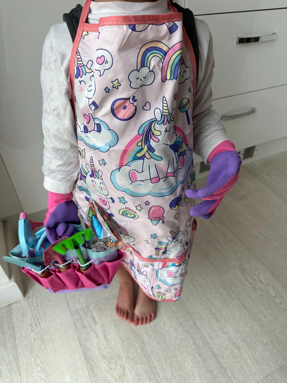 I wanted something for my toddler to play with while I do my own gardening. This is perfect. She loves the apron, it reaches her shins (shes 3 / 93cm) and fits her ok around the waist as its adjustable. It comes with lots of bits, like the pots, spades, spray bottle, watering can, the bag to put everything in and a few other things. Definitely worth it!