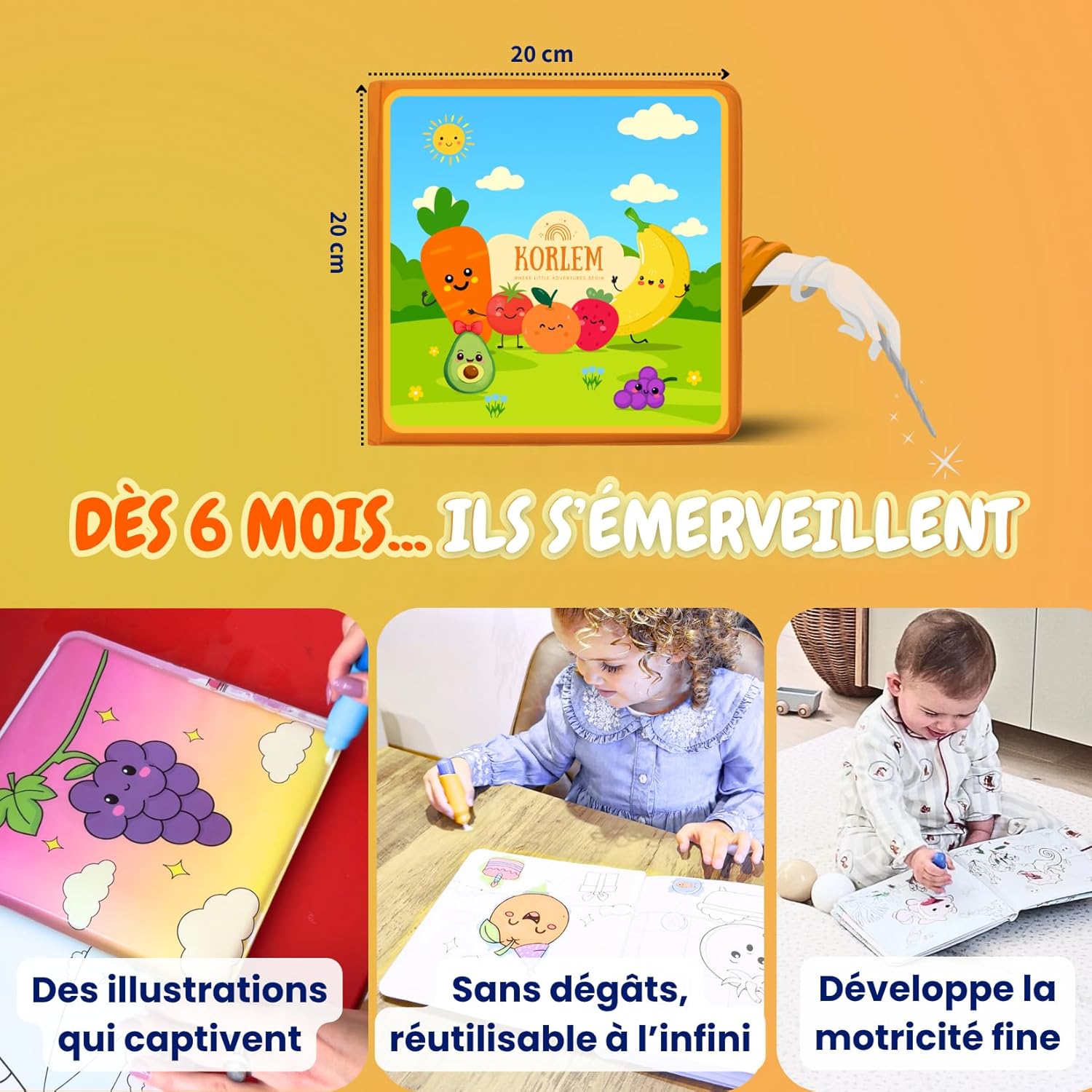 Conçu pour les enfants dès 18 mois, ce livre est doté d’un stylo à eau facile à remplir et parfaitement adapté aux petites mains. Sans odeur, sans produit toxique, il garantit une utilisation 100 % sûre pour les tout-petits. Les parents peuvent ainsi laisser leurs enfants s’amuser librement tout en ayant l’assurance qu’ils manipulent un produit totalement inoffensif.