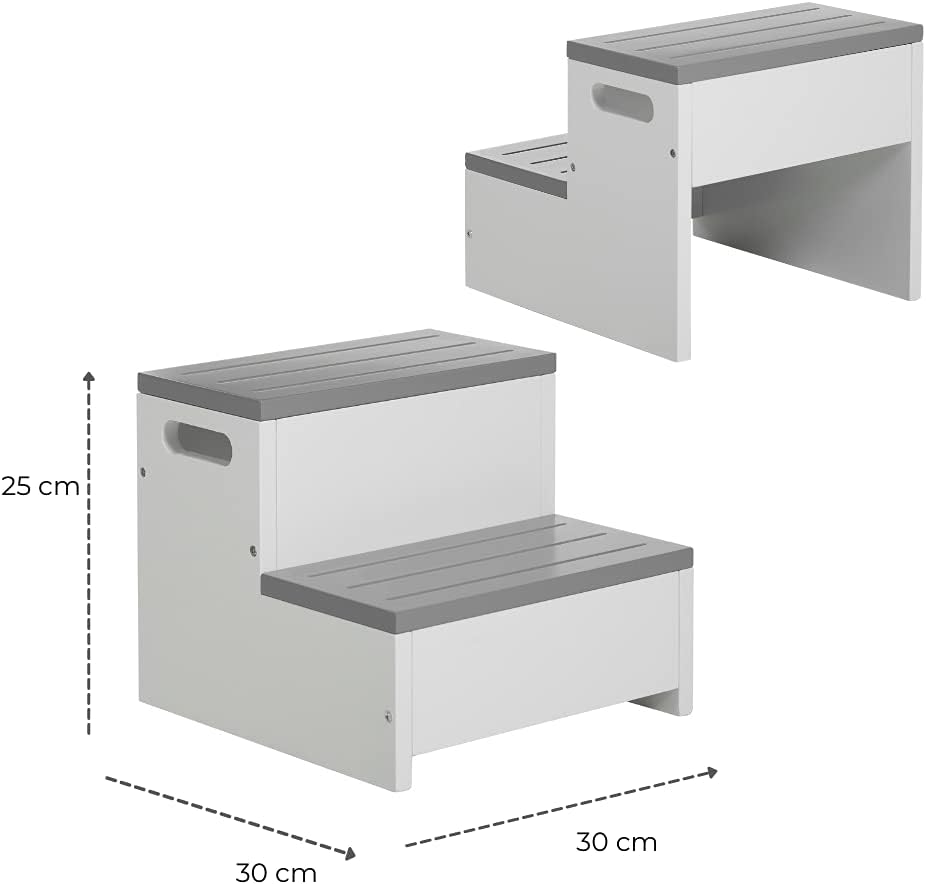 Avec des dimensions compactes (30 cm de largeur x 30 cm de profondeur x 25 cm de hauteur), ce marchepied est parfaitement proportionné pour les enfants dès leur plus jeune âge. Léger et facilement transportable, il se glisse aisément dans les petits espaces, tout en supportant une charge allant jusqu’à 50 kg. Sa finition blanche élégante s’intègre harmonieusement dans n’importe quelle pièce de votre maison.