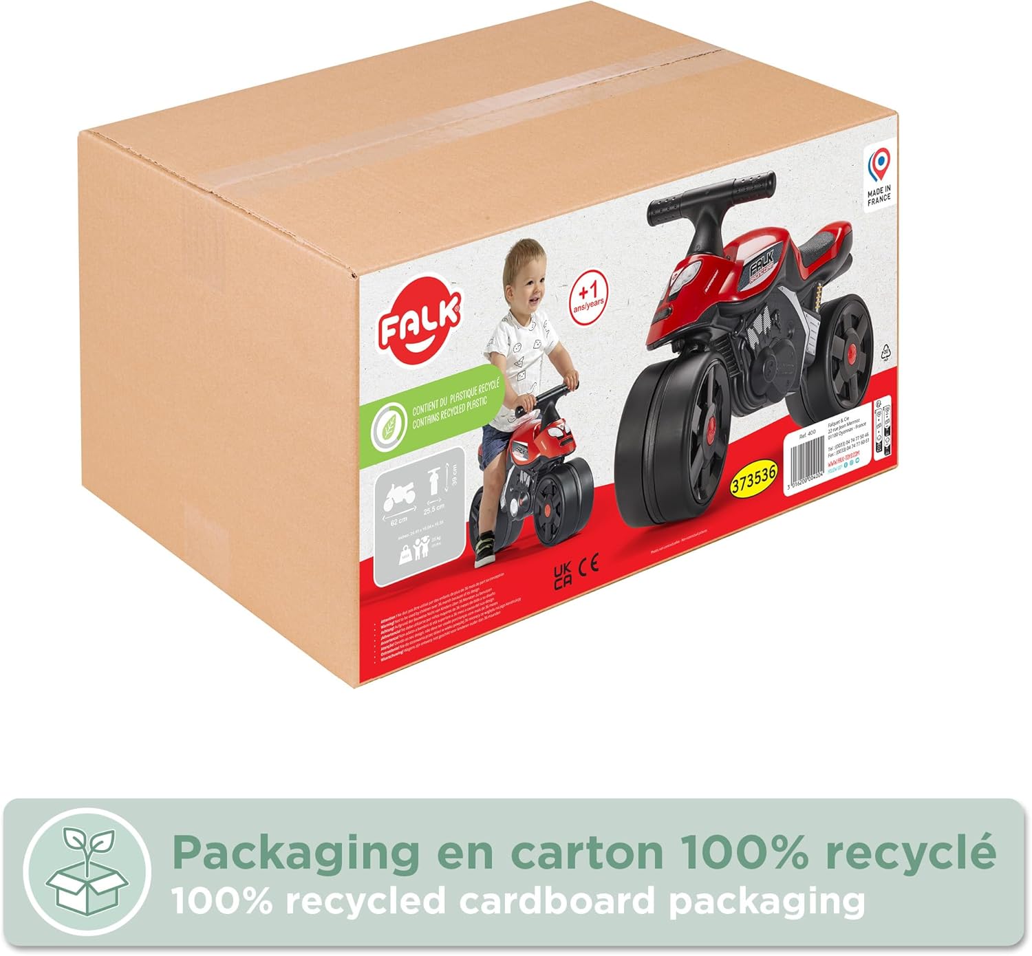 Excellente petite moto, arrive pratiquement montée il suffit d'y insérer le guidon (en suivant l'instruction de montage) et le tour est joué. Ce que j'ai apprécié sur ce jouet est le fait que la moto tienne debout quand mon fils ne l'utilise pas (c'est peut-être bête, mais ça facilite énormément le rangement!), ça lui permet de l'enfourcher plus facilement. Autre chose très appréciable, et cela reste mon opinion, est le fait que les autocollants soient à poser soi-même: étant motard je trouve ça très bien vu, ainsi on peut choisir un look minimaliste et épuré ou bien tous les coller et avoir l'effet gadget. Très bonne construction, le plastique inspire confiance et le principal concerné est aux anges: what else?!