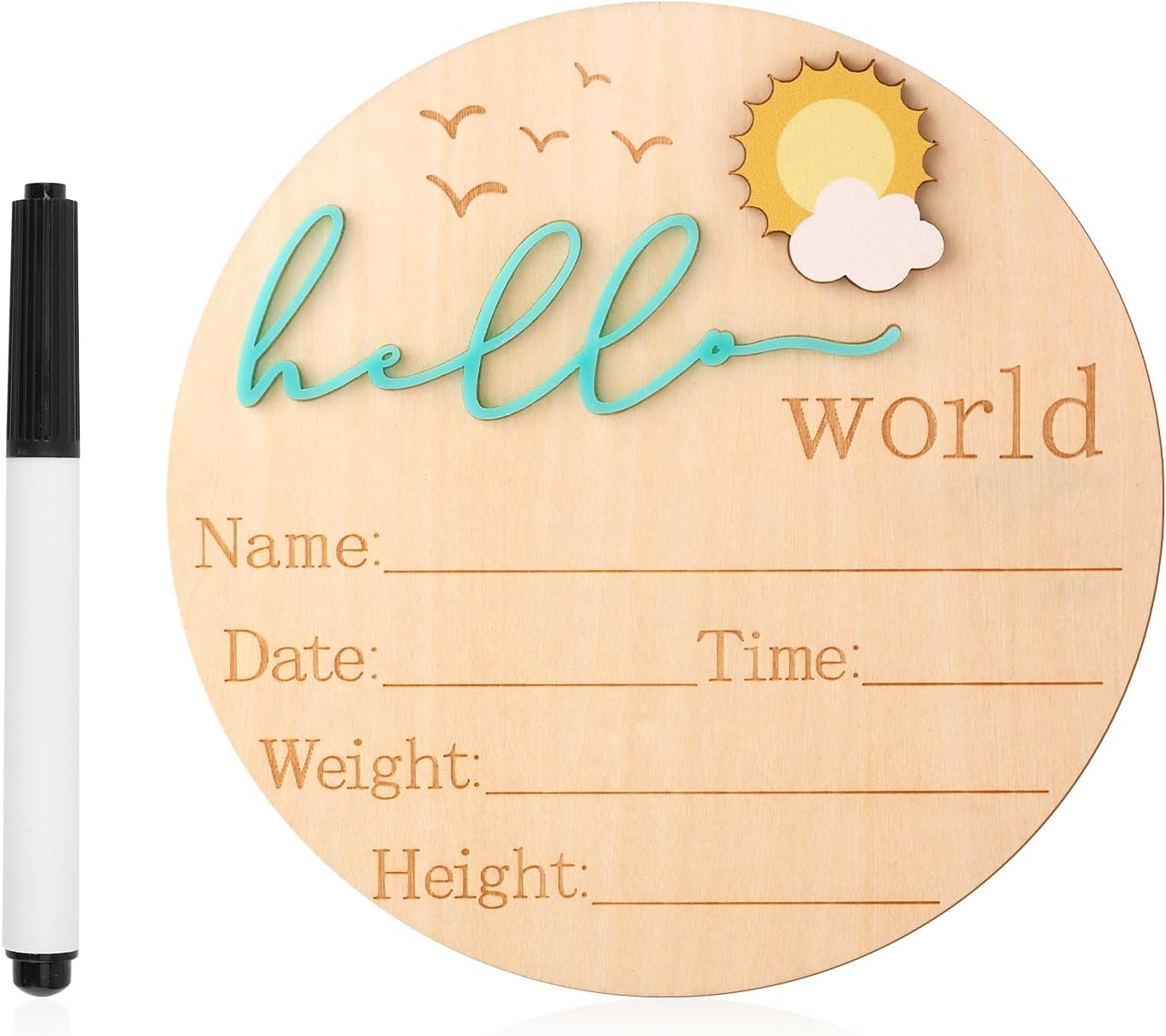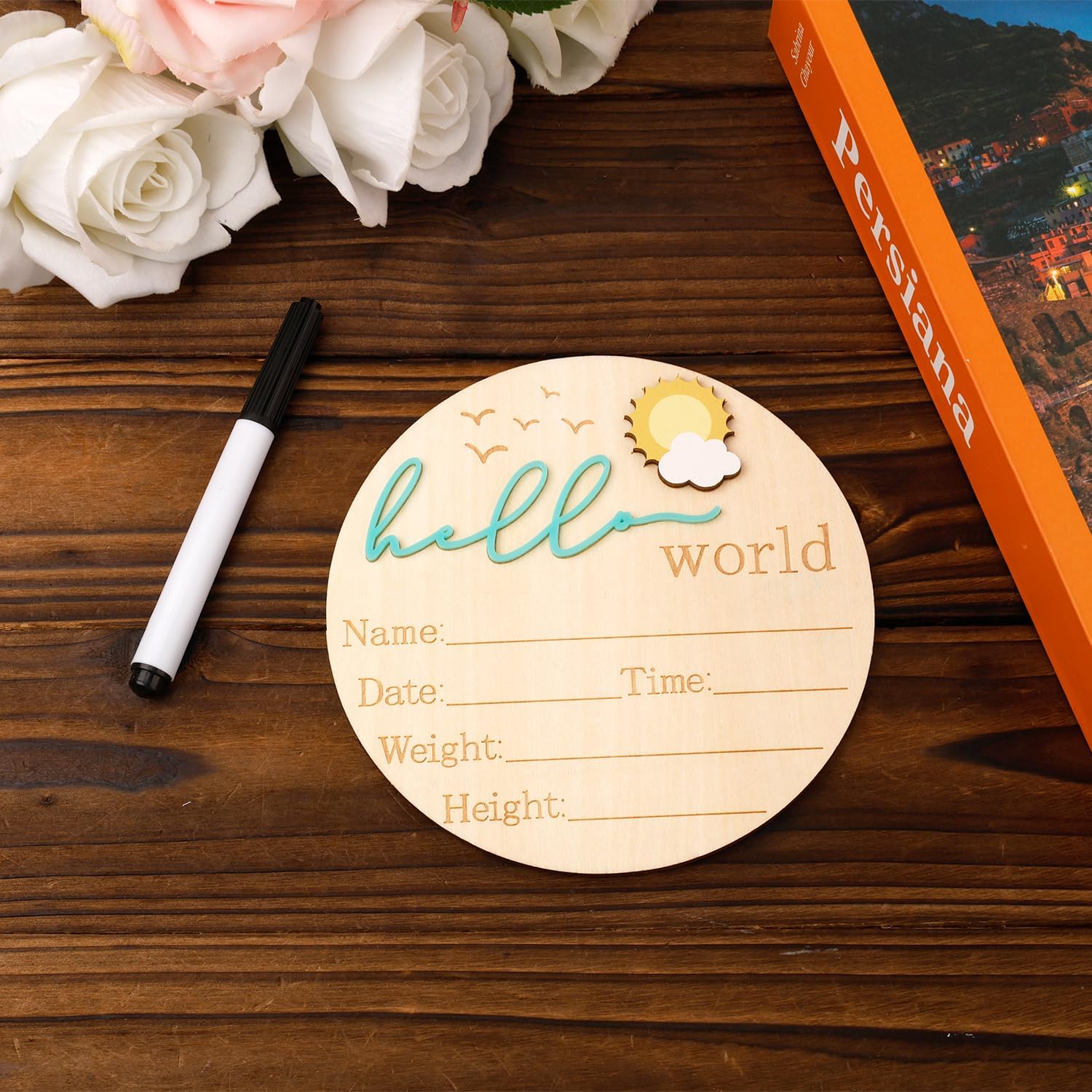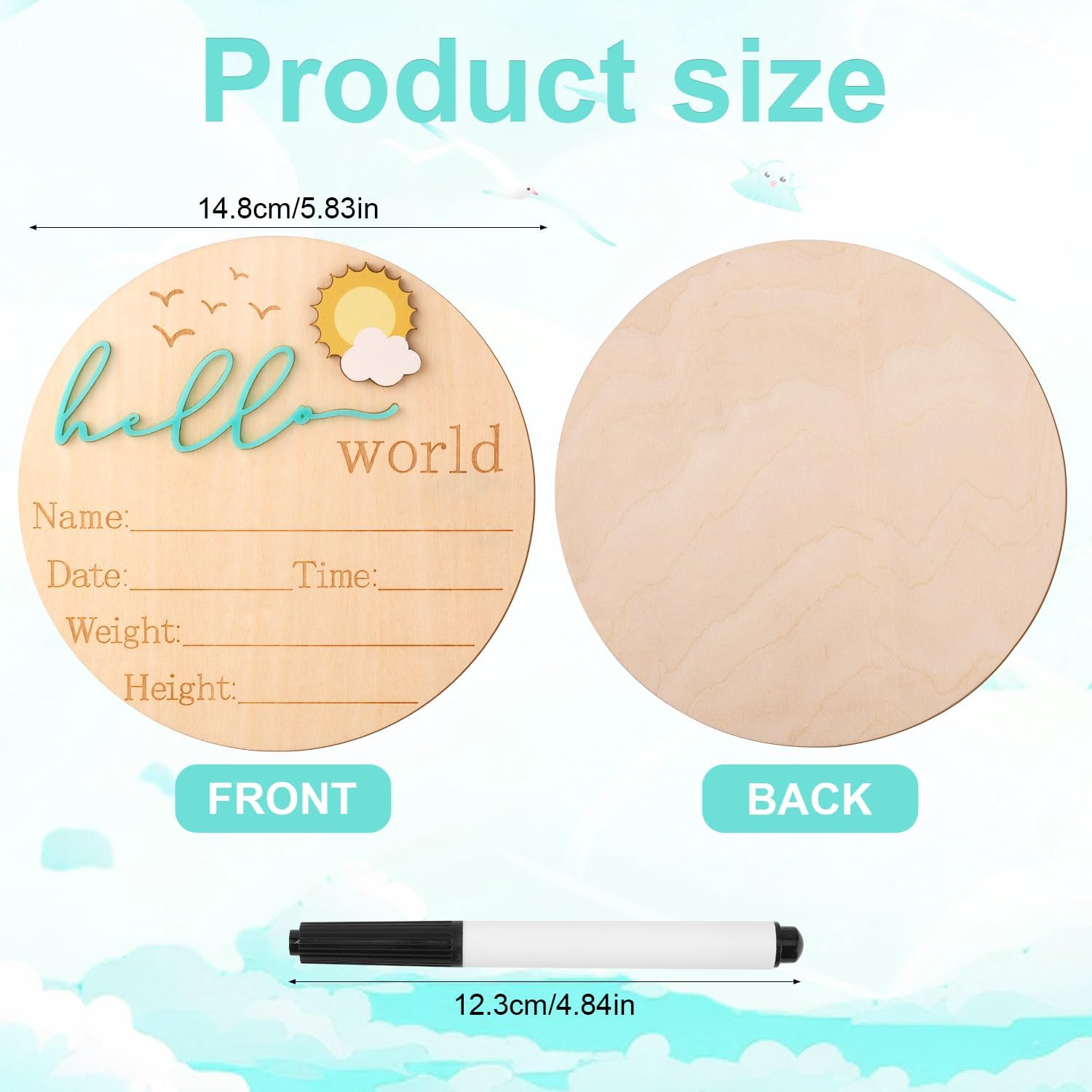 Avec un diamètre idéal de 14,8 cm, ce panneau s’intègre parfaitement dans vos photos de naissance ou comme élément décoratif dans une chambre d’enfant. Son format compact et léger le rend facile à manipuler et à positionner, que ce soit sur un mur, une étagère ou dans un cadre photo. Il est accompagné d’un stylo pratique de 12,3 cm, vous permettant d’inscrire aisément les informations importantes.