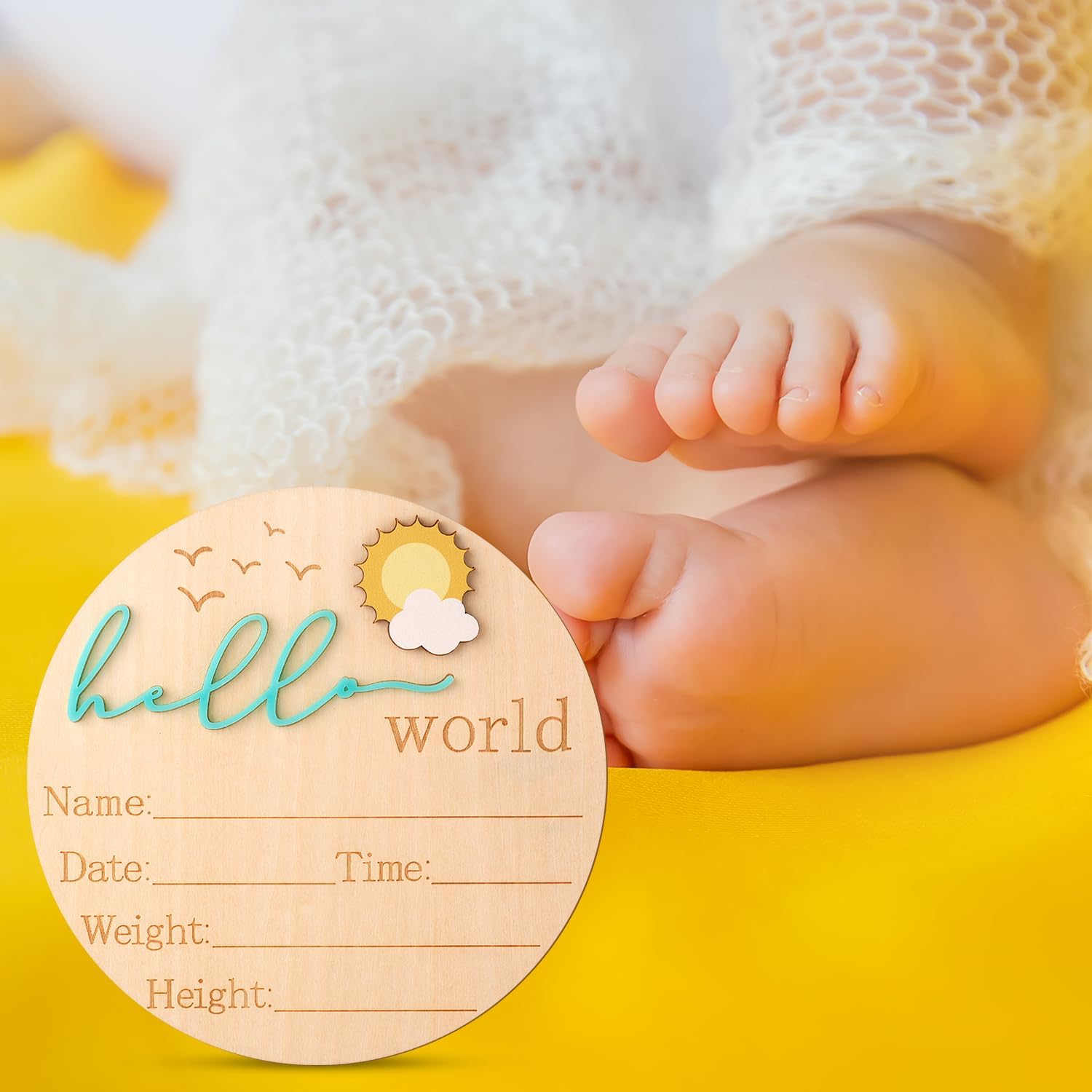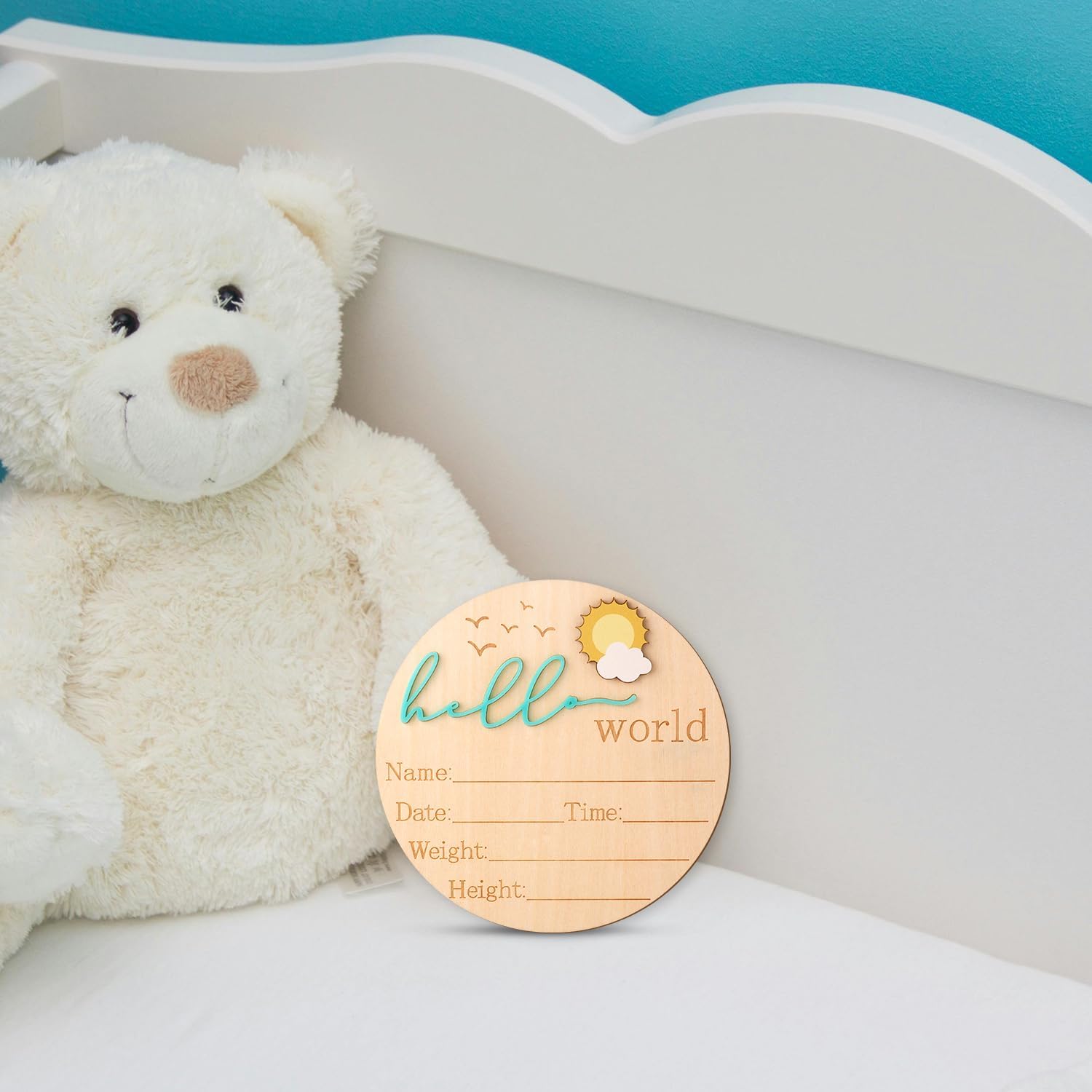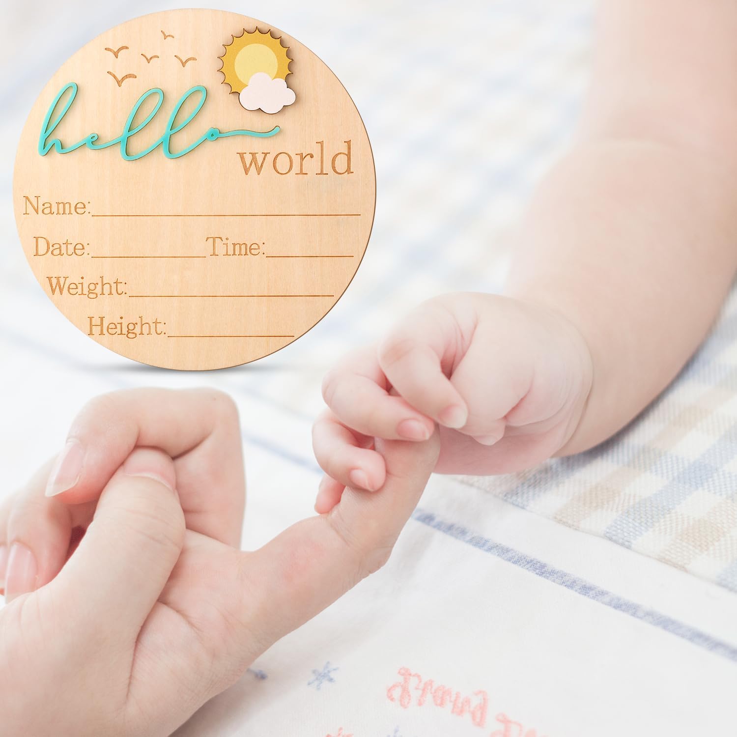 Ce panneau en bois est doté d’un design minutieux et raffiné. Il inclut des colonnes pour inscrire les informations essentielles de votre nouveau-né : nom, date, heure, poids et taille. En plus de sa praticité, il se distingue par son motif en relief représentant un charmant soleil en 3D, accompagné des inscriptions « Hello » et « World » finement gravées. Cette touche ludique et élégante fait de ce panneau un élément unique et chaleureux pour annoncer l’arrivée de votre bébé avec style.
