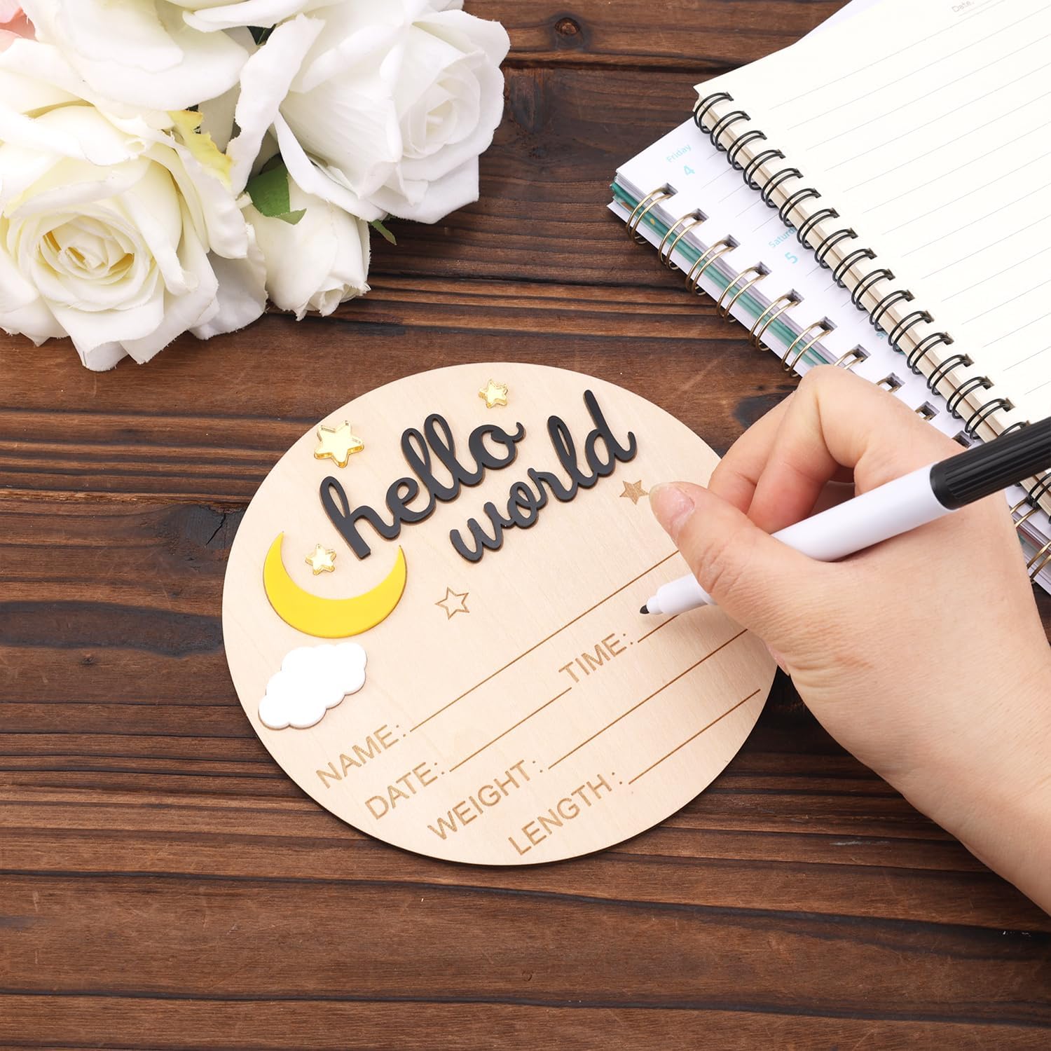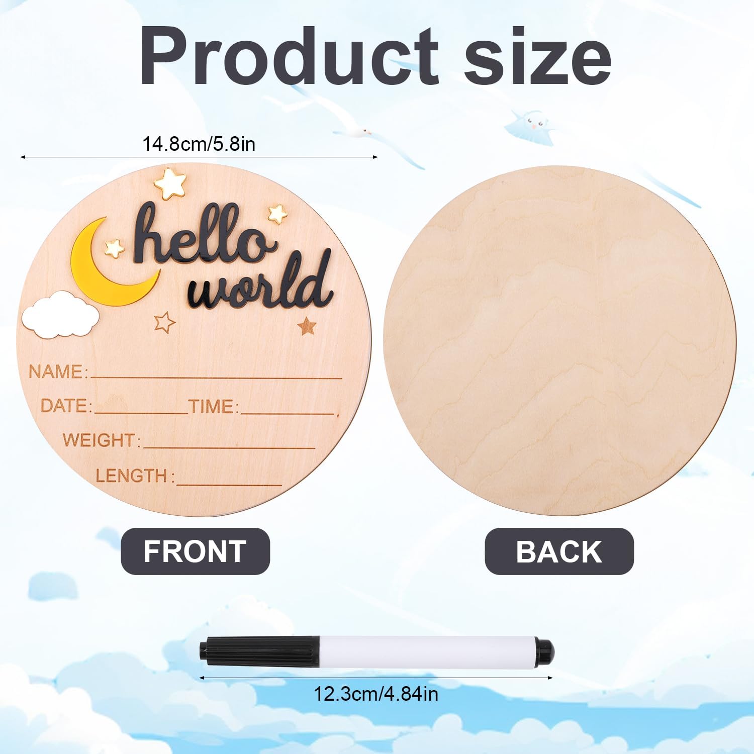 Confectionné avec soin dans un bois de haute qualité, ce panneau offre une finesse de fabrication remarquable. Sa surface lisse et ses bords parfaitement polis garantissent une prise en main agréable et une durabilité exceptionnelle. Résistant au temps, ce panneau est conçu pour conserver intacte la mémoire des premiers jours de votre enfant. Le diamètre d’environ 14,8 cm en fait un objet compact et facile à manipuler tout en étant suffisamment spacieux pour y inscrire toutes les informations importantes.