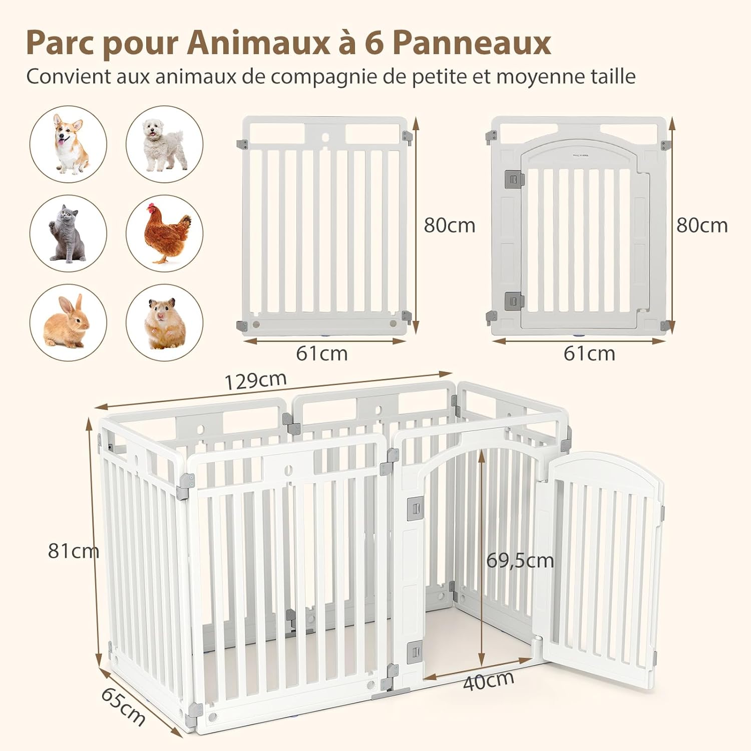 Le parc modulable pour chien s’adapte parfaitement à toutes vos envies et aux besoins de votre compagnon à quatre pattes. Grâce à son design convertible, vous pouvez le configurer selon vos préférences : en parc spacieux ou en enceinte plus restreinte. Doté de 6 panneaux, il convient idéalement aux chiens de petite à moyenne taille, offrant un espace sécurisé et accueillant pour qu’ils puissent s’épanouir en toute sérénité.