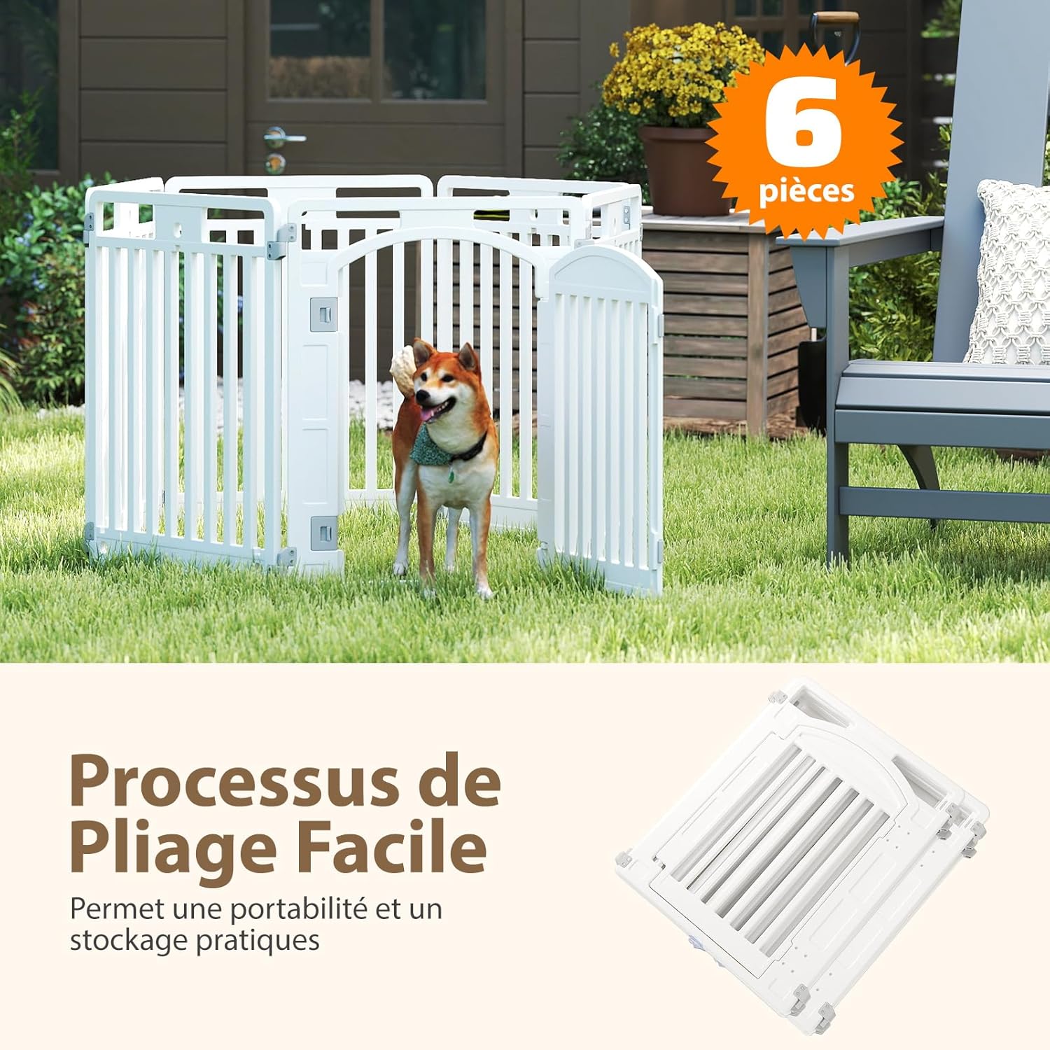 Le parc modulable a été pensé pour vous simplifier la vie. Grâce à son design pliable, il se replie facilement jusqu’à une taille compacte, facilitant ainsi son rangement dans les espaces restreints. Les poignées découpées intégrées permettent un transport aisé, que vous soyez à la maison ou en déplacement. Une solution parfaite pour les propriétaires de chiens soucieux de concilier praticité et bien-être animal.