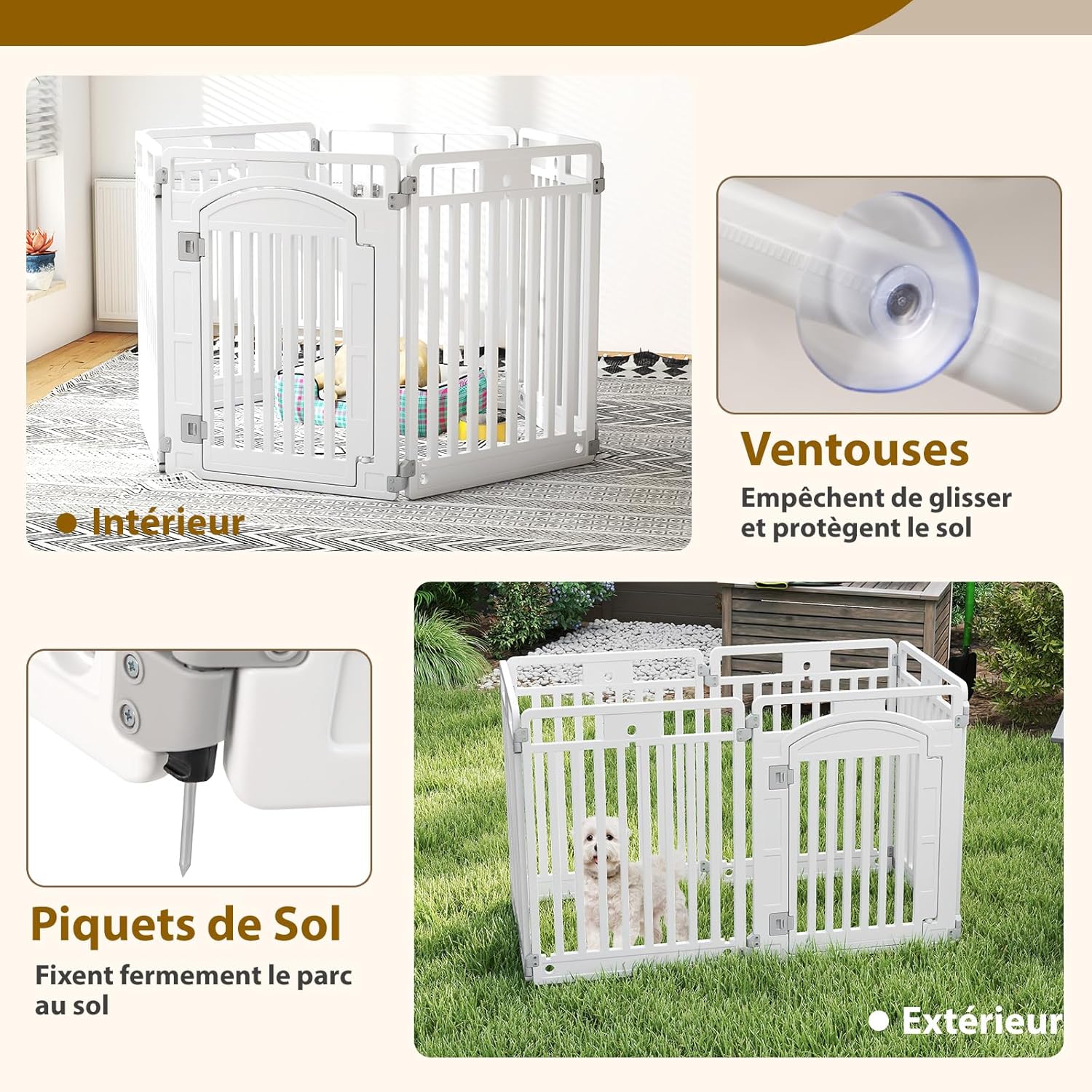 Que vous souhaitiez utiliser ce parc en intérieur ou en extérieur, il s’adapte à toutes les situations. Équipé de ventouses antidérapantes pour une fixation ferme sur les sols lisses et de piquets pour une stabilité accrue sur les surfaces extérieures, ce parc portable offre une polyvalence incomparable. Votre chien bénéficiera d’un espace clos et sécurisé, peu importe l’endroit où vous l’installez.