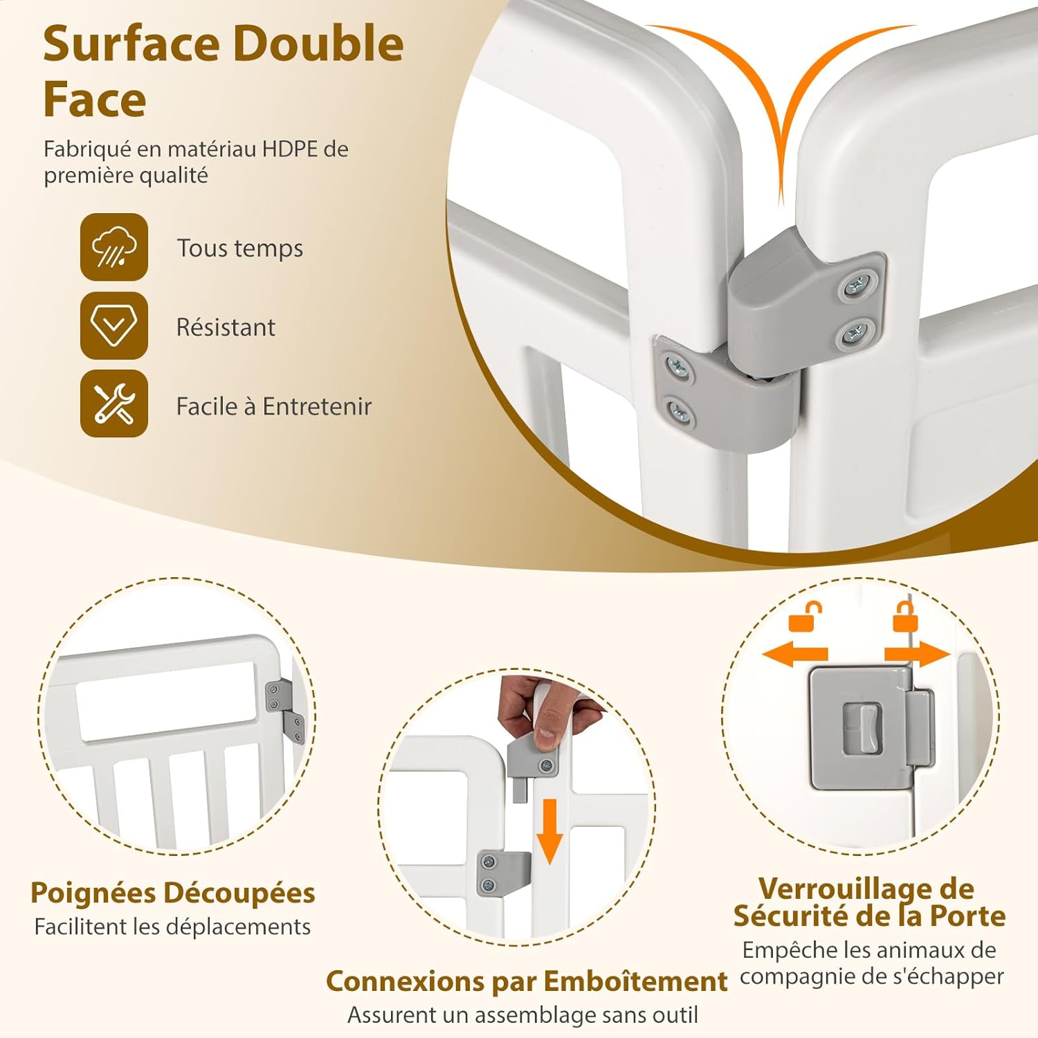 Conçu en HDPE (polyéthylène haute densité), ce parc allie solidité, durabilité et entretien simplifié. Sa structure double-face intègre une porte verrouillable, garantissant une sécurité optimale pour votre chien tout en facilitant vos interactions avec lui. Offrez-lui un espace de vie qui inspire confiance, sans compromis sur la qualité ni sur la sécurité.