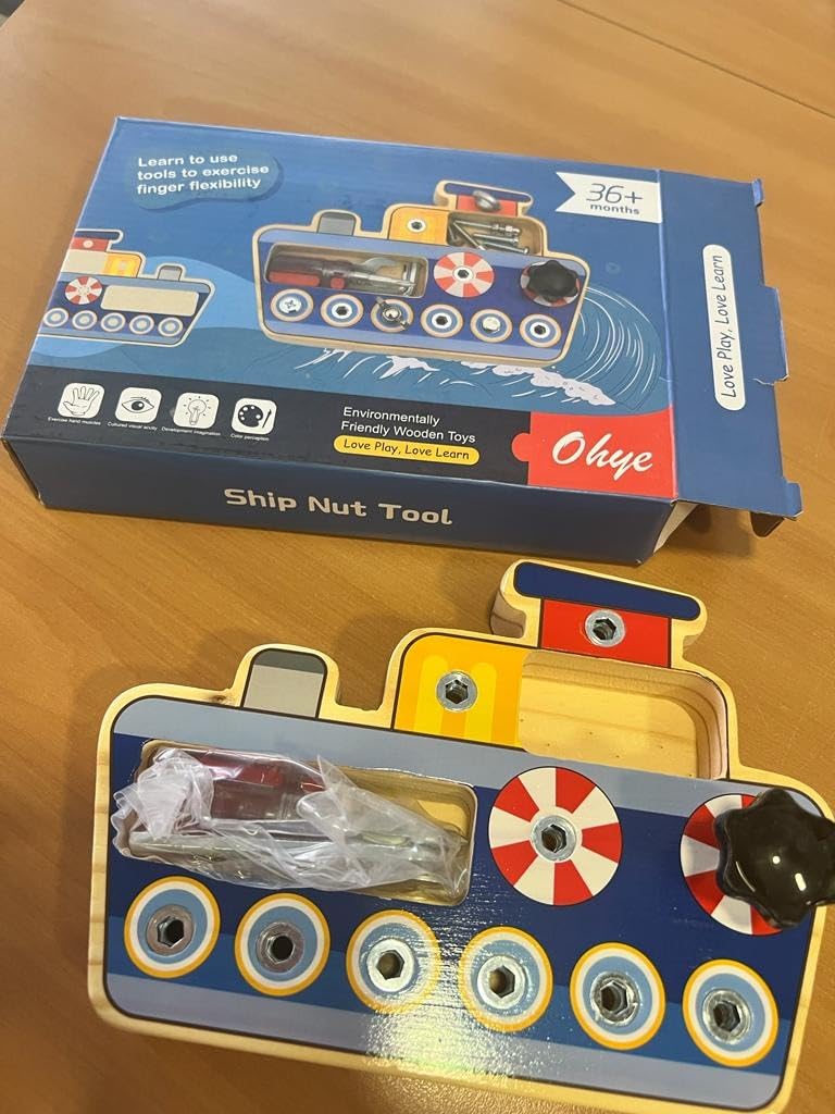 A que niño no le gusta usar las herramientas que ve que usan los adultos. Pues este juguete es perfecto para ellos. ☝ Al recibir el producto primero he pensado que seria pequeño, pero no hace falta que sea más grande. Tiene todo tipo de tornillos con diferentes encajes para utilizar las diferentes herramientas que trae. Como se ve en la imagen tiene un par de llaves allen, un destornillador y una llave inglesa que no es muy útil y tal vez un poco complicada de usar por los niños, pero compensan las otras herramientas las cuales podras utilizar fàcilmente. Cada tornillo, palometa se puede poner en un agujero cosa que hace que quede recogido. ❌ El barco tiene un hueco donde poner las herramientas cosa que si tubiera una tapita se agradeceria para el transporte ya que en la caja no cabe con los tornillos encajados. La figura de madera tiene unos colores muy vivos y muy buenos acabados. Todo bien lijado y sin astillas. Por lo demas es muy divertido y a los niños les encanta.