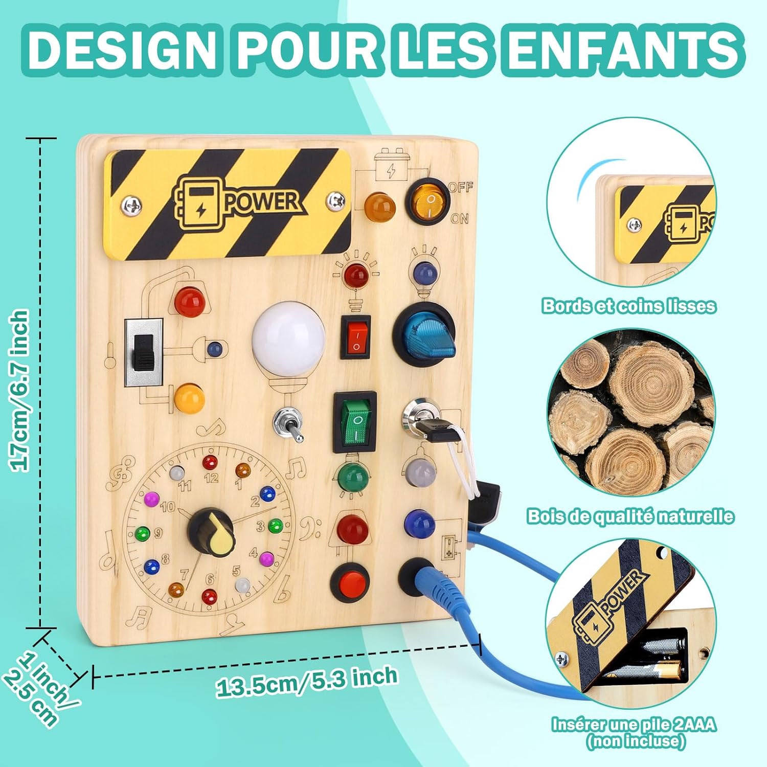 Stimulez la curiosité et le développement de votre enfant avec cette planche d’activités Montessori en bois naturel, équipée de 10 interrupteurs interactifs et de lumières LED douces.