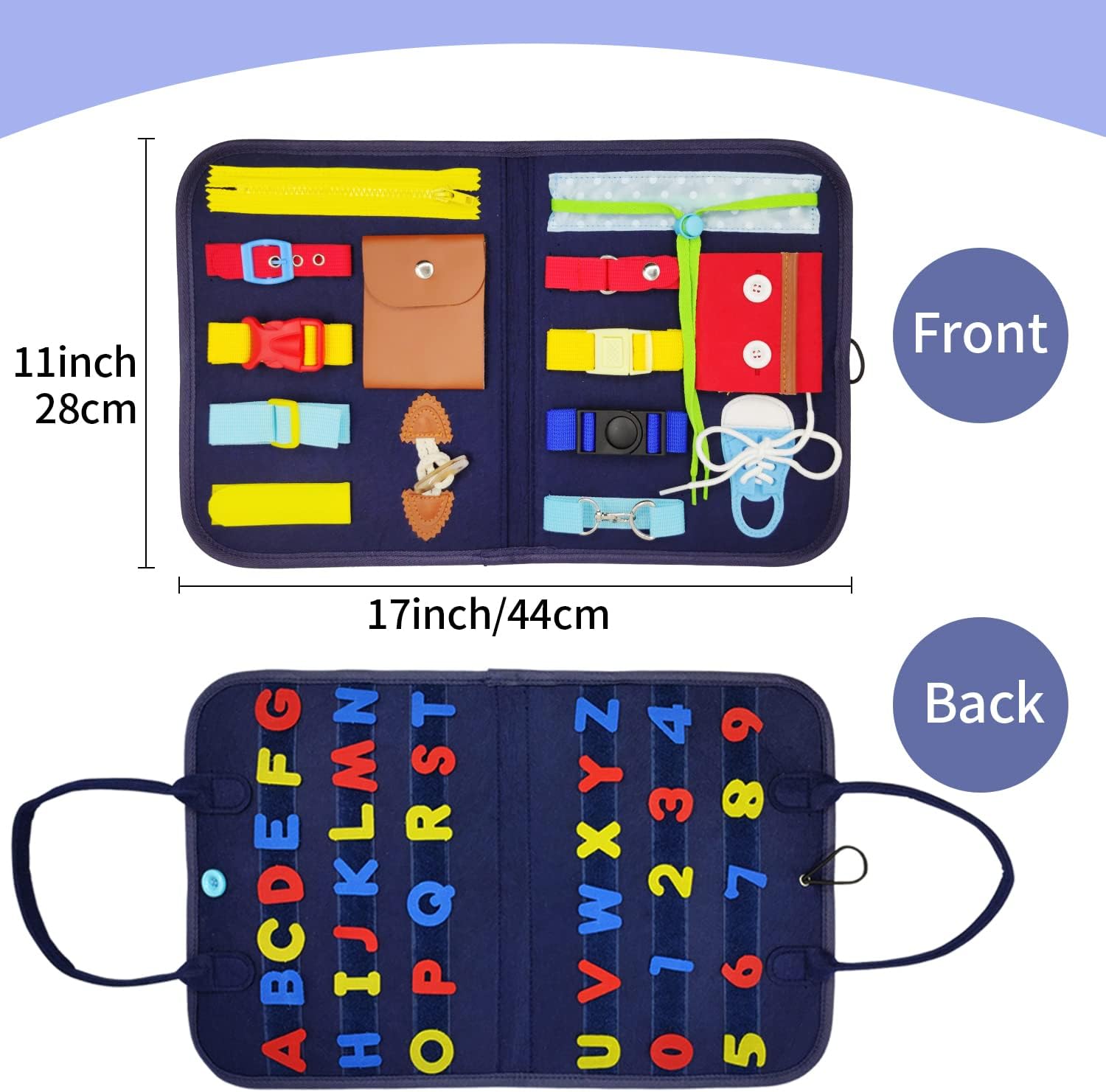Avec des dimensions pratiques de 28 x 22 cm une fois pliée et un poids plume de seulement 220 grammes, cette planche d’activités est facilement transportable. Elle est équipée d’une poche zippée permettant de ranger les accessoires ou de petits objets du quotidien. Que ce soit pour un long trajet en voiture, un vol en avion ou une simple sortie, ce jouet éducatif accompagne votre enfant partout où il va.