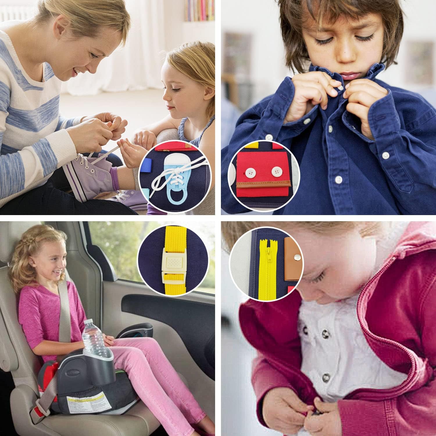 Chaque élément a été soigneusement pensé pour reproduire des gestes du quotidien, rendant ainsi l’apprentissage pratique et applicable dans la vie réelle. Avec cette planche, les enfants peuvent s’exercer à manipuler des accessoires tout en renforçant leur adaptabilité.